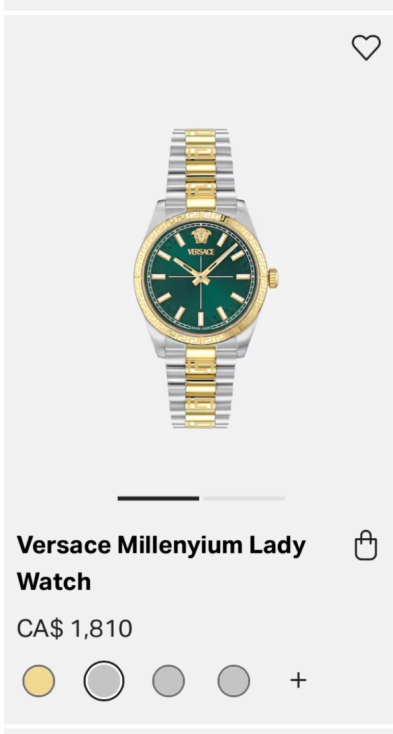 This is a Versace Millenium Lady watch. It features a two-tone stainless steel and gold band with a green dial. The watch has a gold bezel and hands.