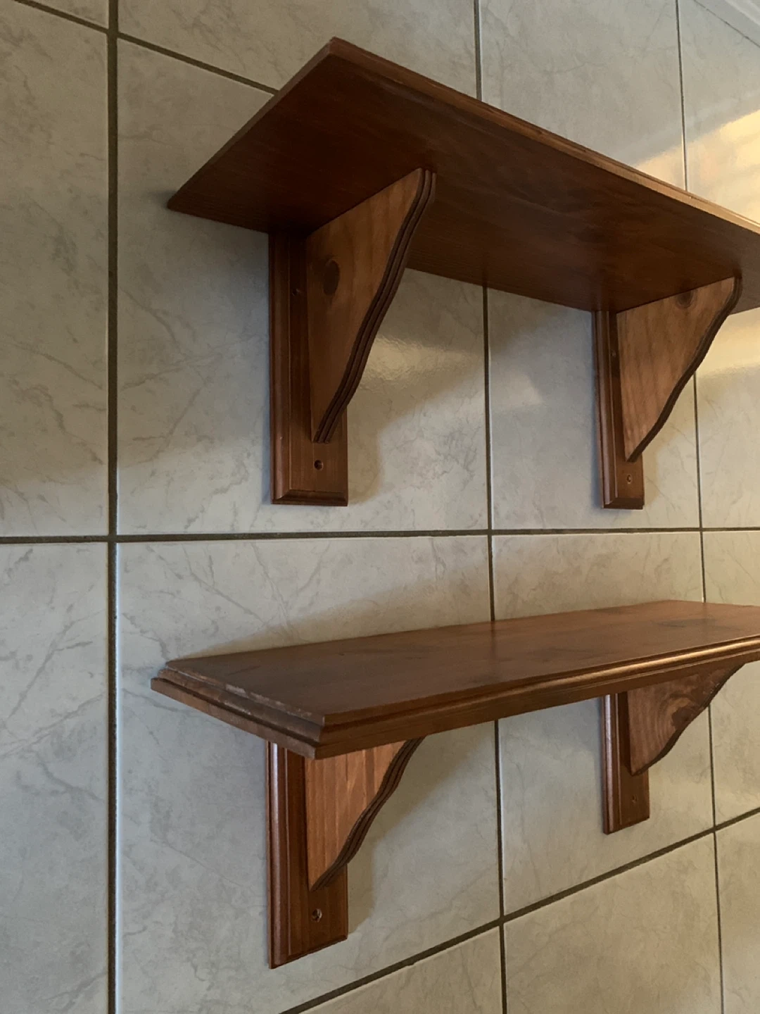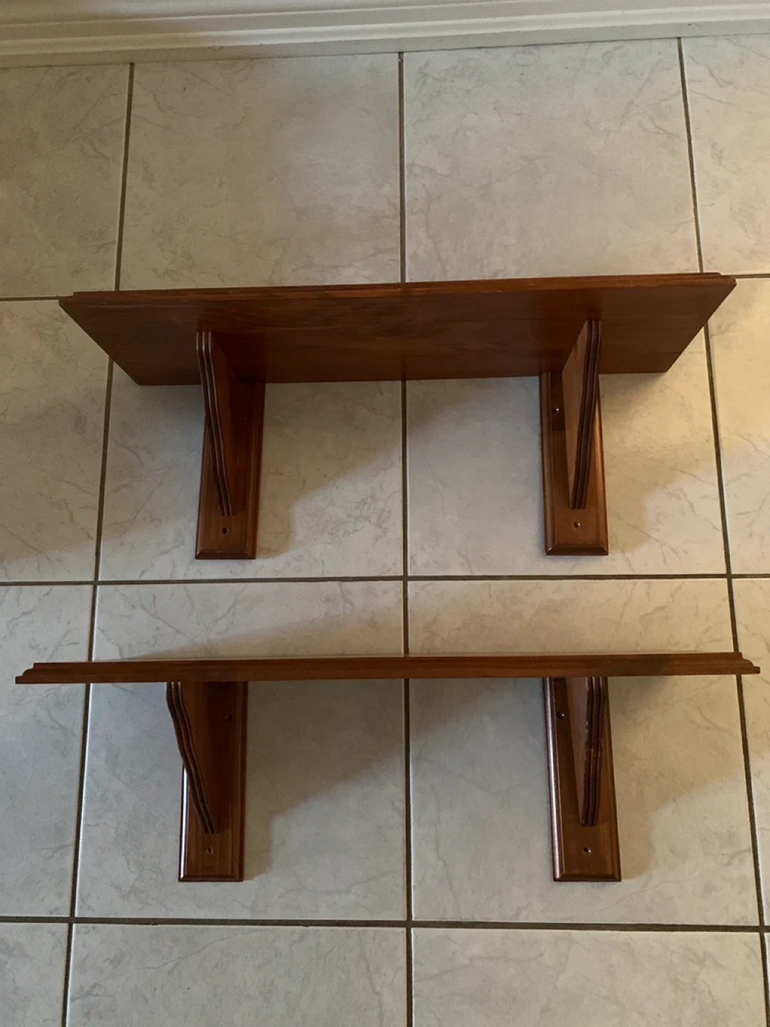 A set of two wooden wall shelves with a rich wood stain. They're suitable for displaying books, decor, or small plants. The shelves are made of solid wood. Measure 23” wide x 9” long x 8” deep, offering at $10 each