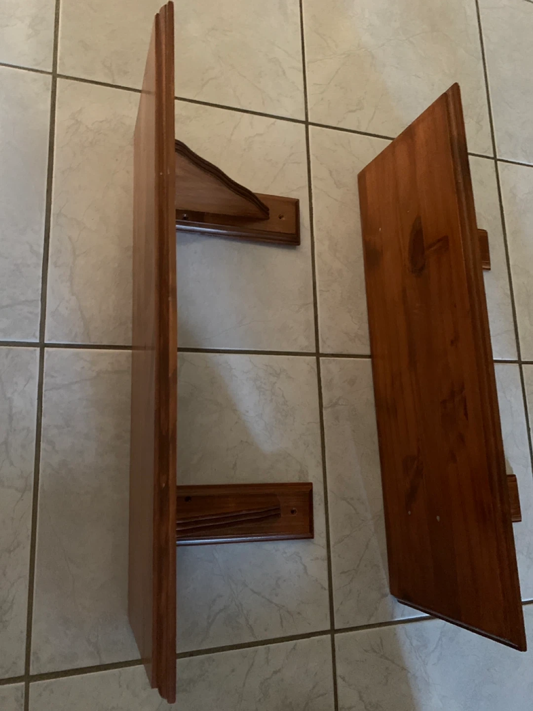 A set of two wooden wall shelves with a rich wood stain. They're suitable for displaying books, decor, or small plants. The shelves are made of solid wood. Measure 23” wide x 9” long x 8” deep, offering at $10 each
