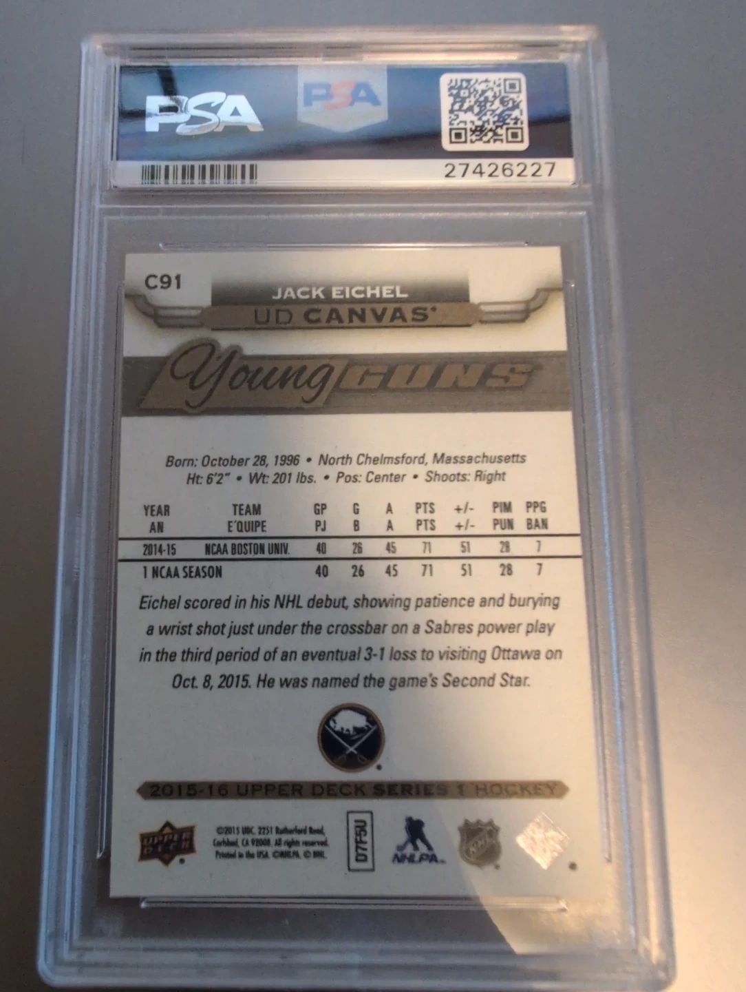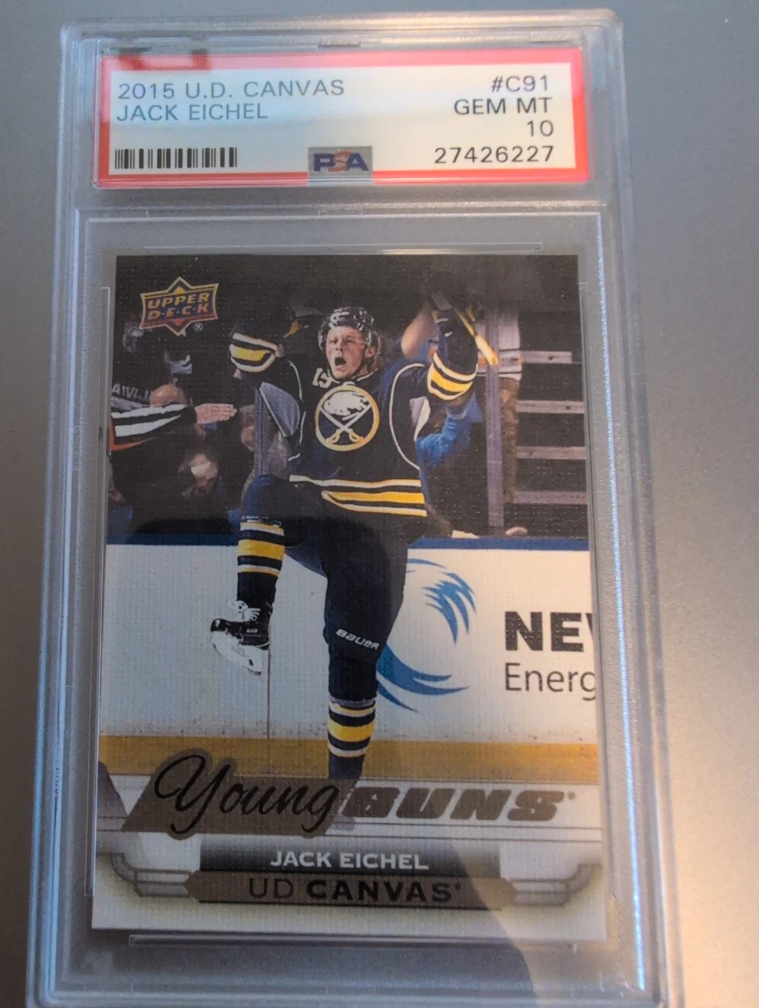 Buy & SellJack Eichel 2015 UD Canvas Young Guns Hockey Card PSA 10Jack Eichel 2015 UD Canvas Young Guns Hockey Card PSA 10$183Selling a Jack Eichel 2015 Upper Deck Canvas Young Guns hockey card. It's graded PSA 10 GEM MT. A great addition to any hockey card collection!ConditionNewWHERE TO MEETShops at Morgan CrossingView MapSELLERverifiedGarrettMorgan Heights600 reviews1 chats·1 favorites·21 viewsSEND CHAT TO SELLERHi Garrett! I’m interested in your listing.Hi Garrett! I’m interested in your listing.Get the Karrot app to chatSign In to chat