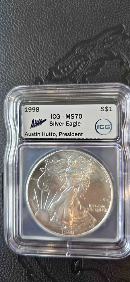 Museum-quality 1998 American Silver Eagle, professionally certified MS70 by ICG. This coin is a true collector’s prize, featuring a prestigious Austin Hutto Hand-Signed Label.