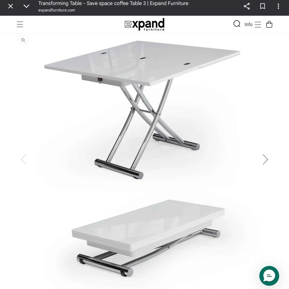 Modern space-saving coffee table from Expand Furniture, originally over $1200. This versatile table easily lifts, rotates, and unfolds into a full dining-height table, perfect for small apartments or condos. It features high-quality mechanics for smooth lifting and folding, all in a sleek, compact design. Converts from coffee table to dining table, with adjustable height from 8" to 30". The tabletop lifts, rotates, and folds open. Hidden wheels in the legs make it easy to move. Rounded corners offer a modern and safe design. Fully assembled and ready to use. Condition is very good, with a small, minor scuff on one leg that is not very noticeable. Great for condos, small spaces, or anyone who loves smart, multifunctional furniture.