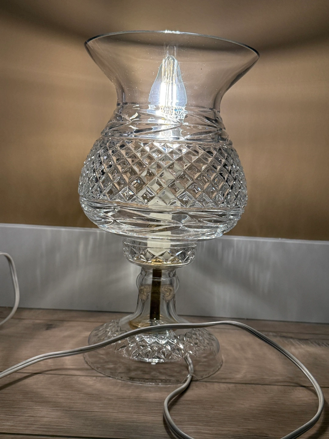 Here's a lovely vintage table lamp that would look great in any room. It's made of clear glass with a beautiful diamond-cut pattern. It has a classic design and a warm, inviting glow. Perfect for adding a touch of elegance to your home!