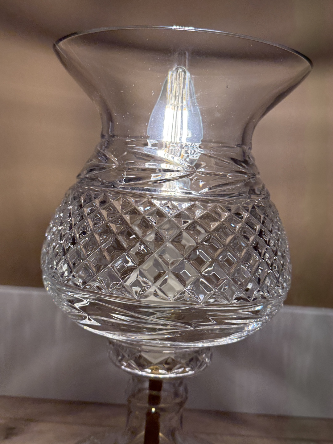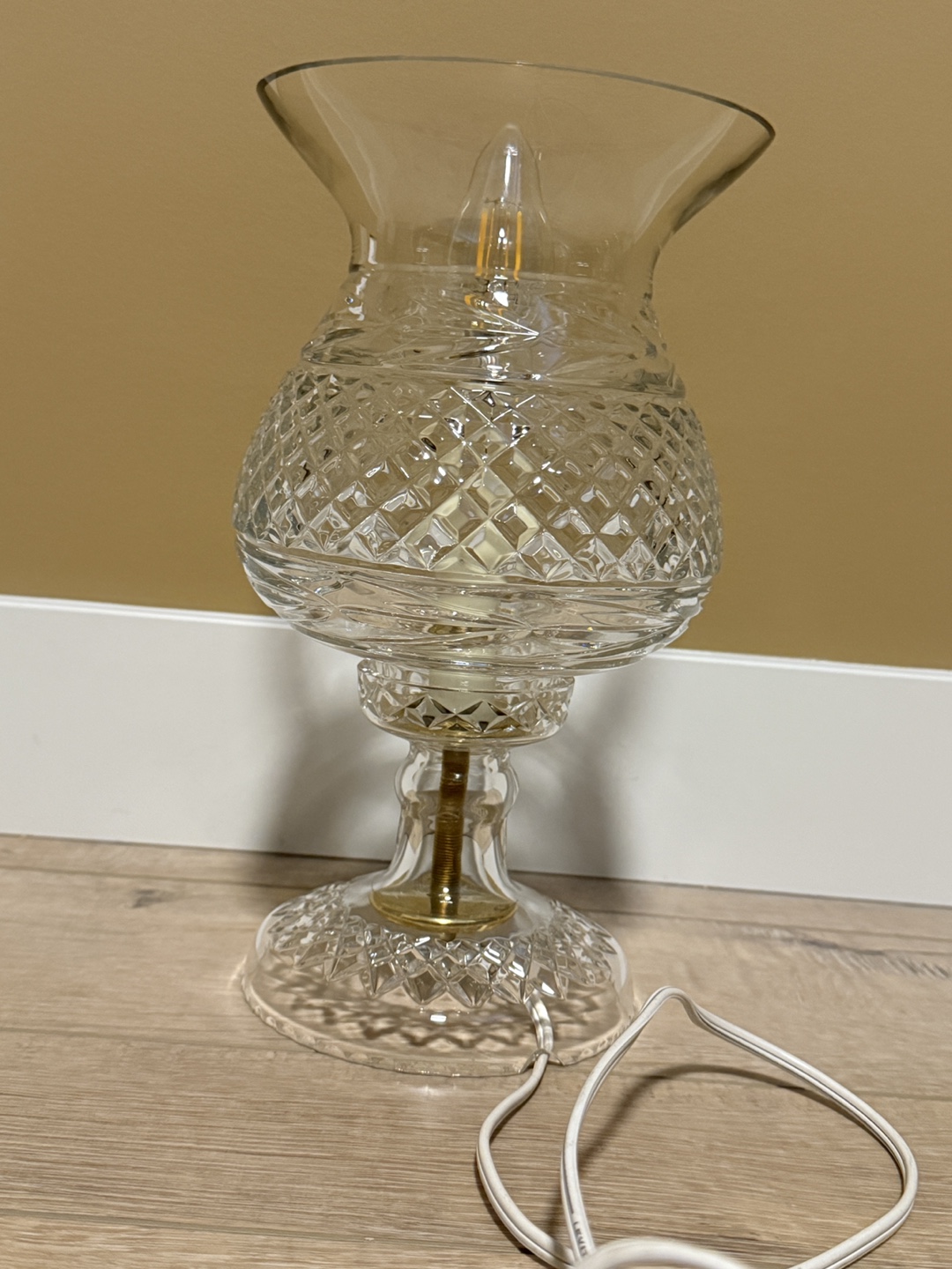 Here's a lovely vintage table lamp that would look great in any room. It's made of clear glass with a beautiful diamond-cut pattern. It has a classic design and a warm, inviting glow. Perfect for adding a touch of elegance to your home!