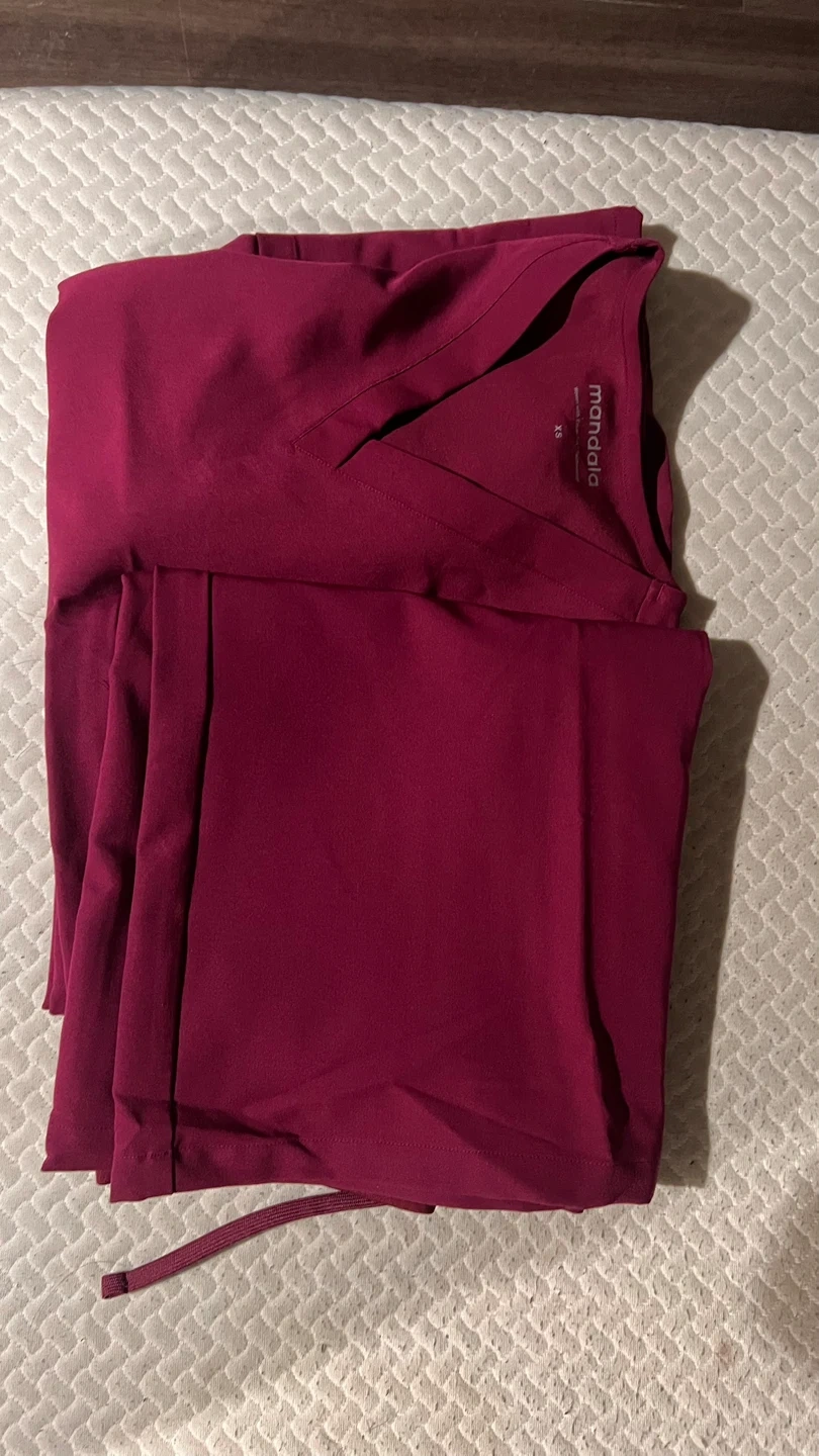 This is a Mandala brand scrubs set. It's a size XS in a burgundy colour. The set includes a V-neck top and drawstring pants. It’s a brand new and unused piece. I ordered the incorrect size therefore I’m selling it.
