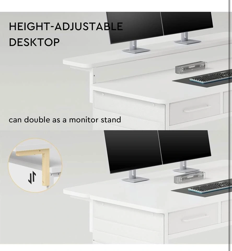Versatile white desk with a height-adjustable monitor stand. Features three storage drawers and handy side pockets. Great for a home office or gaming setup. Measures 47" wide, 22" deep, and 33" high. Monitor stand is 7" deep and 3.9" high.
