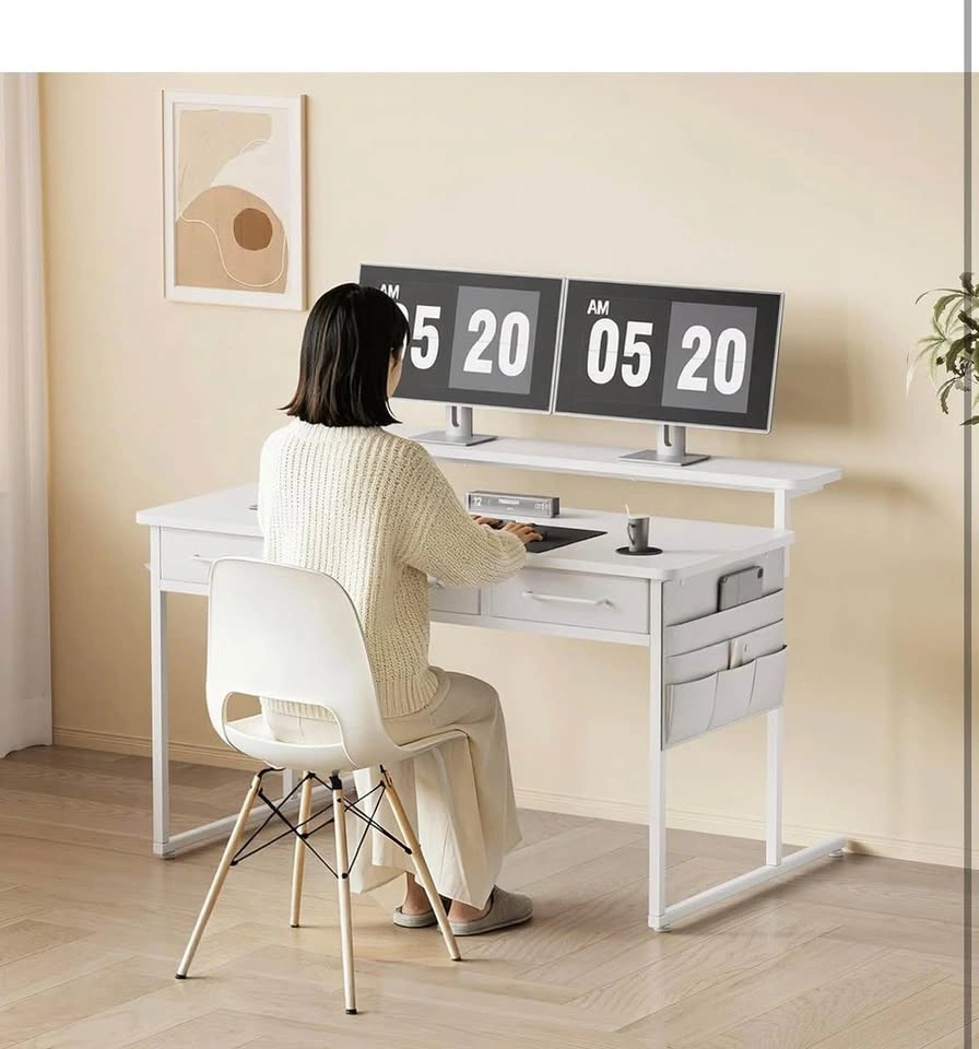 White Desk w/ Monitor Stand & Storage Drawers