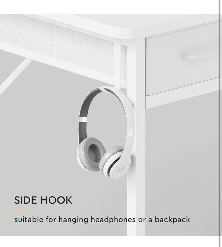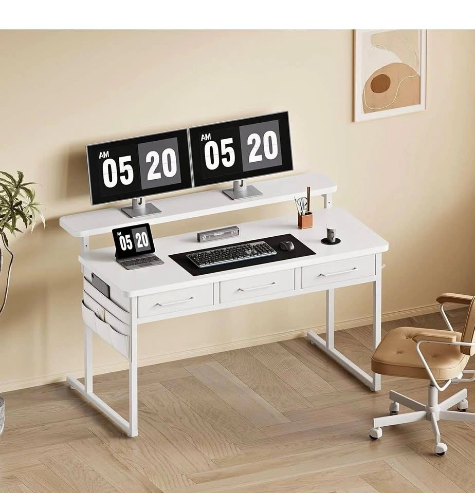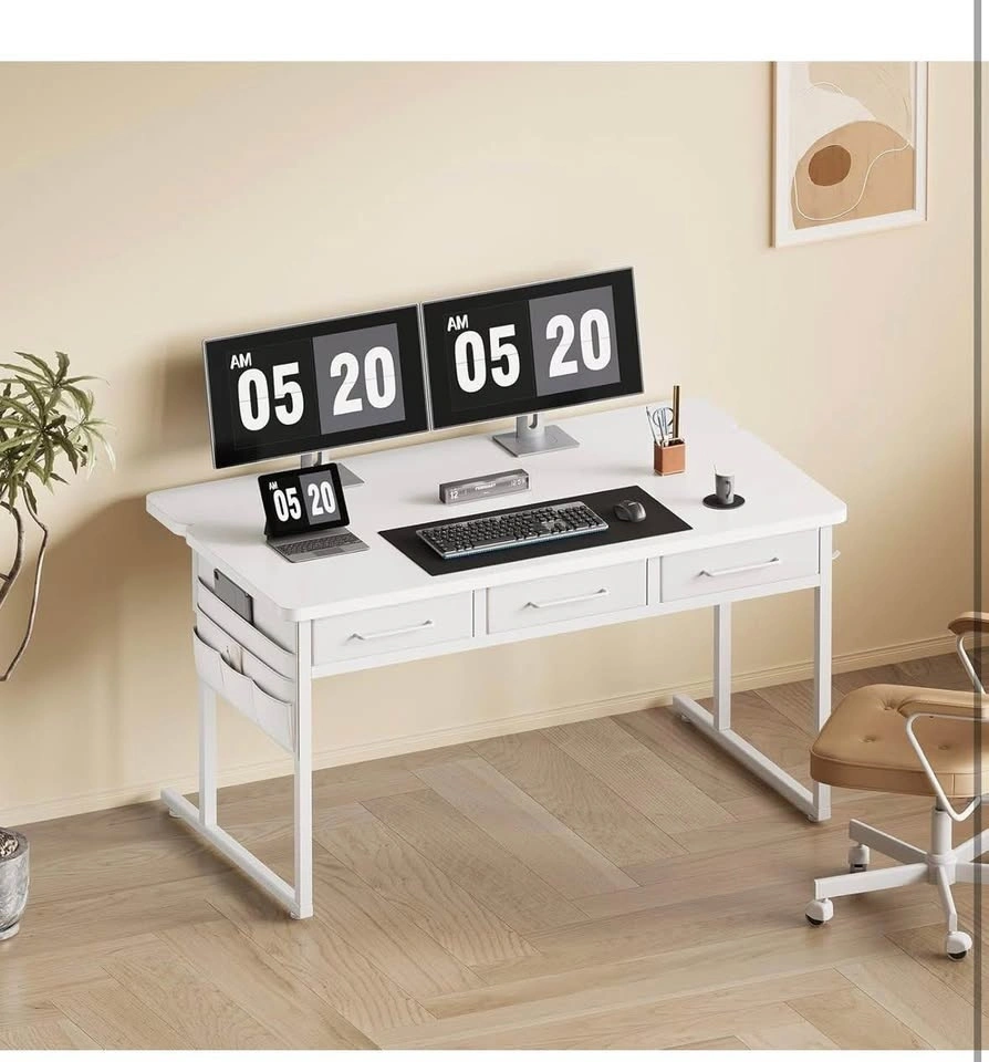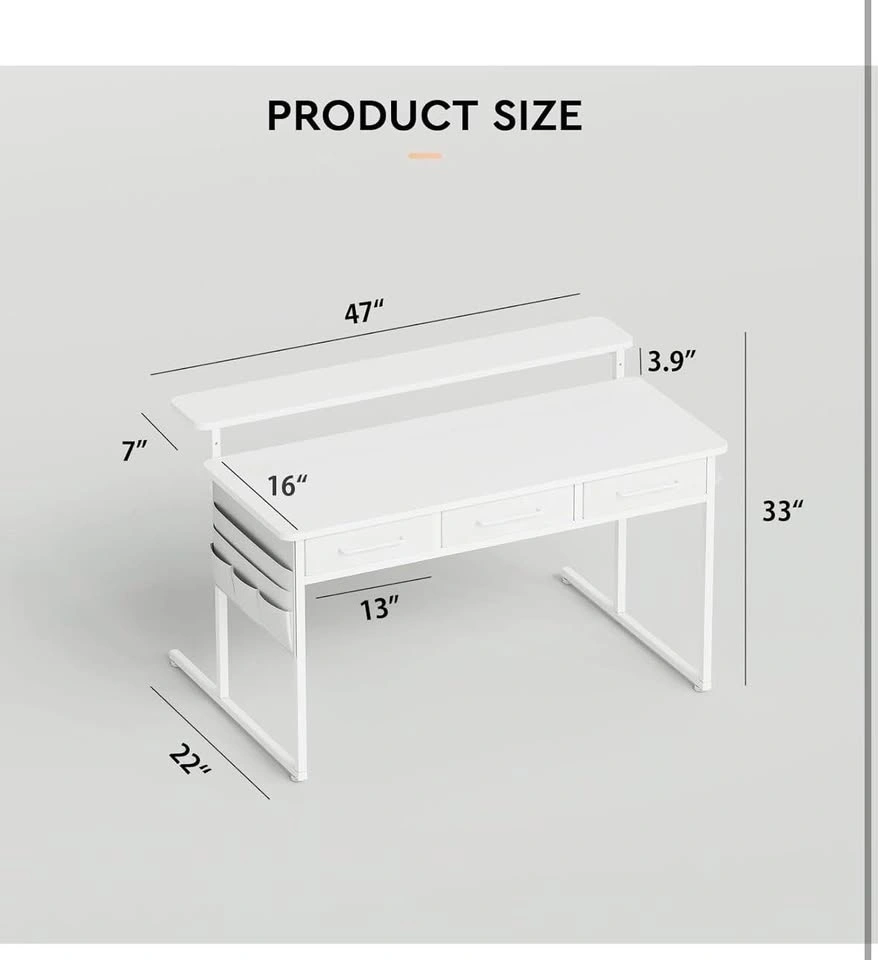 Versatile white desk with a height-adjustable monitor stand. Features three storage drawers and handy side pockets. Great for a home office or gaming setup. Measures 47" wide, 22" deep, and 33" high. Monitor stand is 7" deep and 3.9" high.