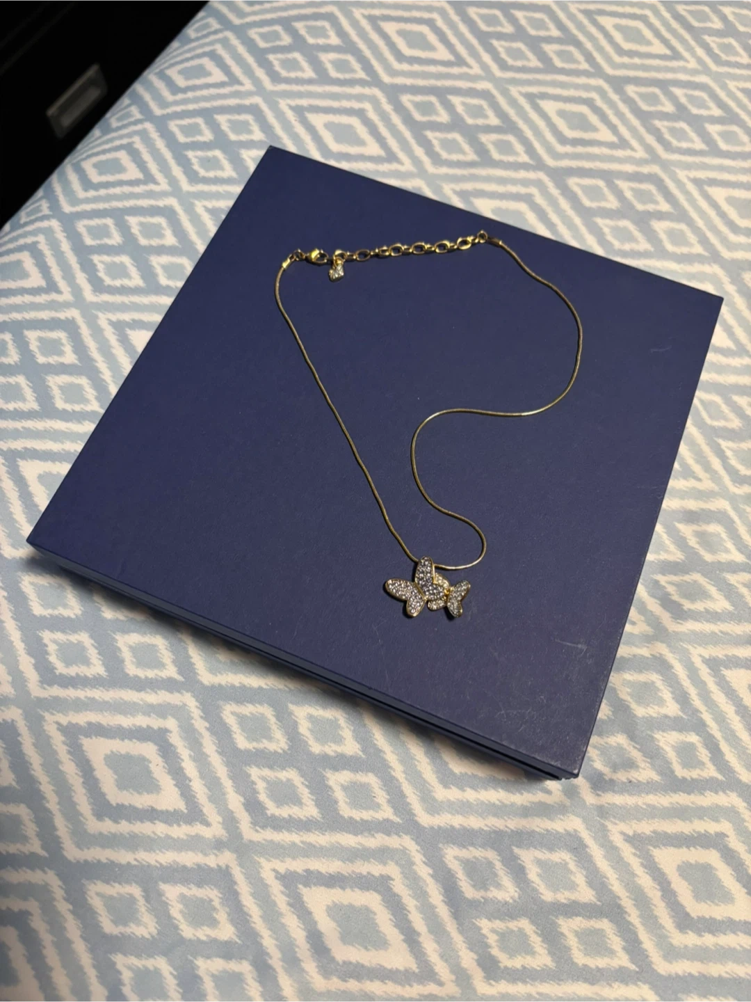 This is a gold-tone necklace featuring a delicate butterfly pendant adorned with sparkling crystals. It has an adjustable clasp for a comfortable fit. It's a lovely accessory for adding a touch of elegance to any outfit!