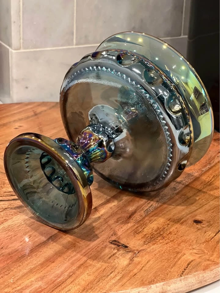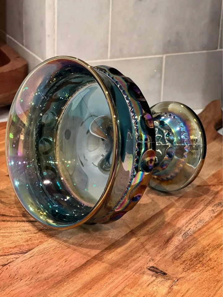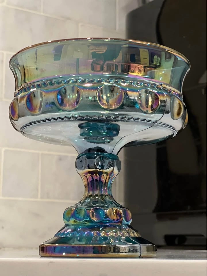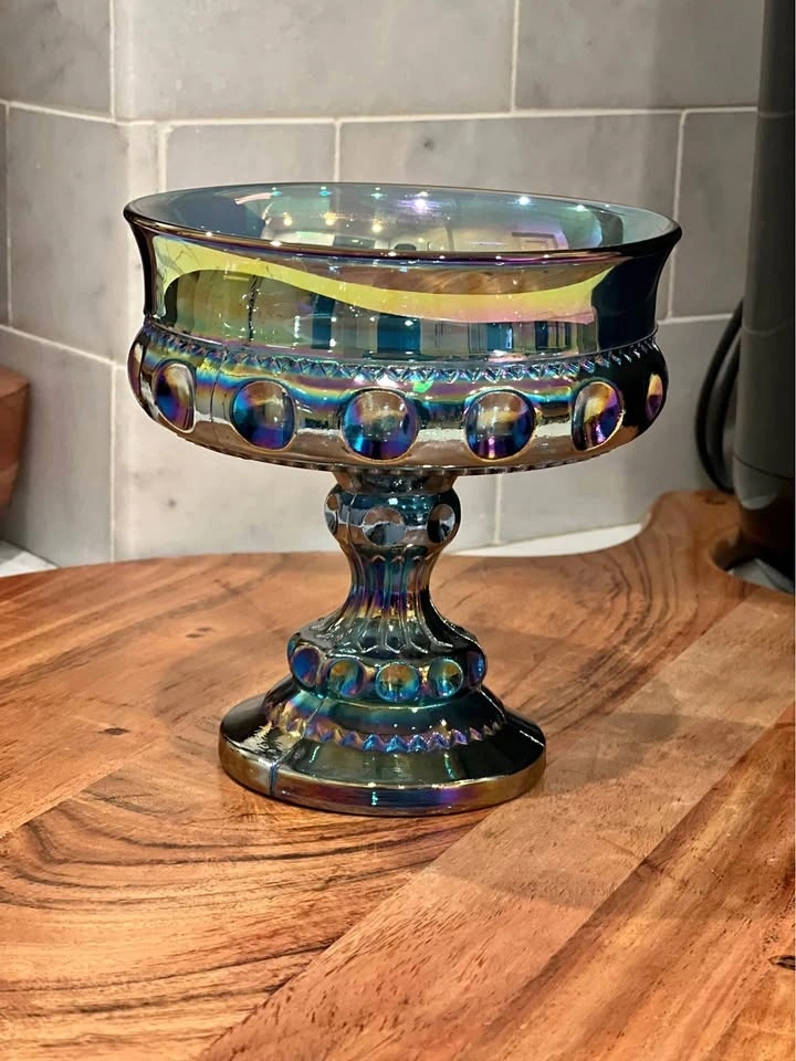 A beautiful vintage Indiana Glass “Kings Crown” thumbprint compote, crafted in shimmering blue carnival glass. Made by Indiana Glass Company in their well-loved “Kings Crown” (Thumbprint) design. Carnival glass with a vibrant iridescent finish that reflects rainbow hues under the light. Pedestal compote or candy dish, also known as a “wedding bowl,” perfect for serving treats or displaying as a centerpiece. Excellent vintage condition with no chips or cracks. Approximately 5.25" tall with a diameter of about 5". A striking collectible for carnival glass lovers, or a perfect accent piece for vintage table décor.