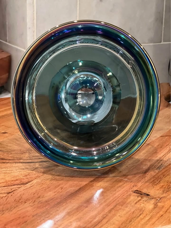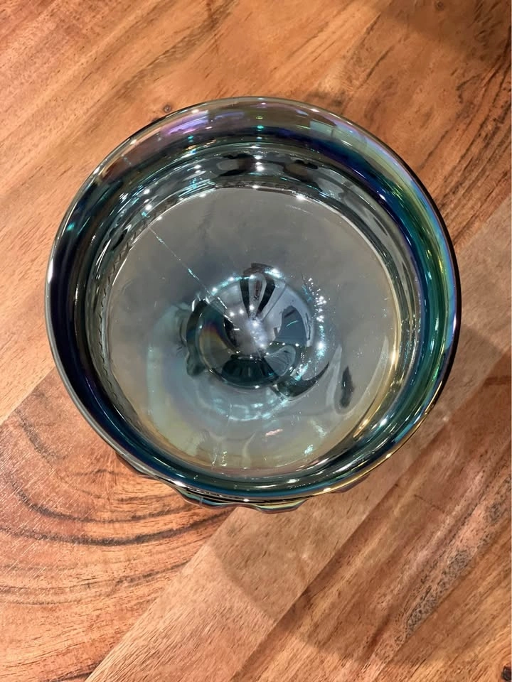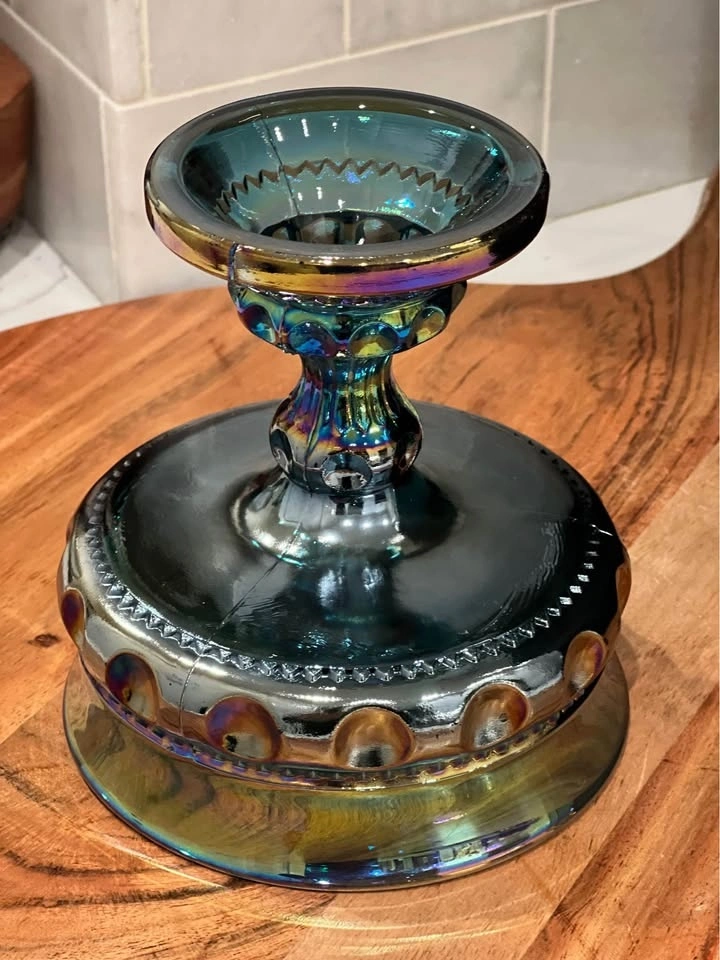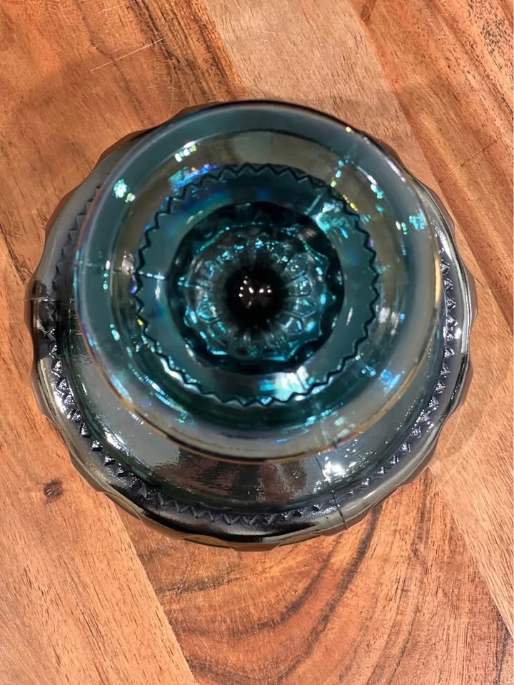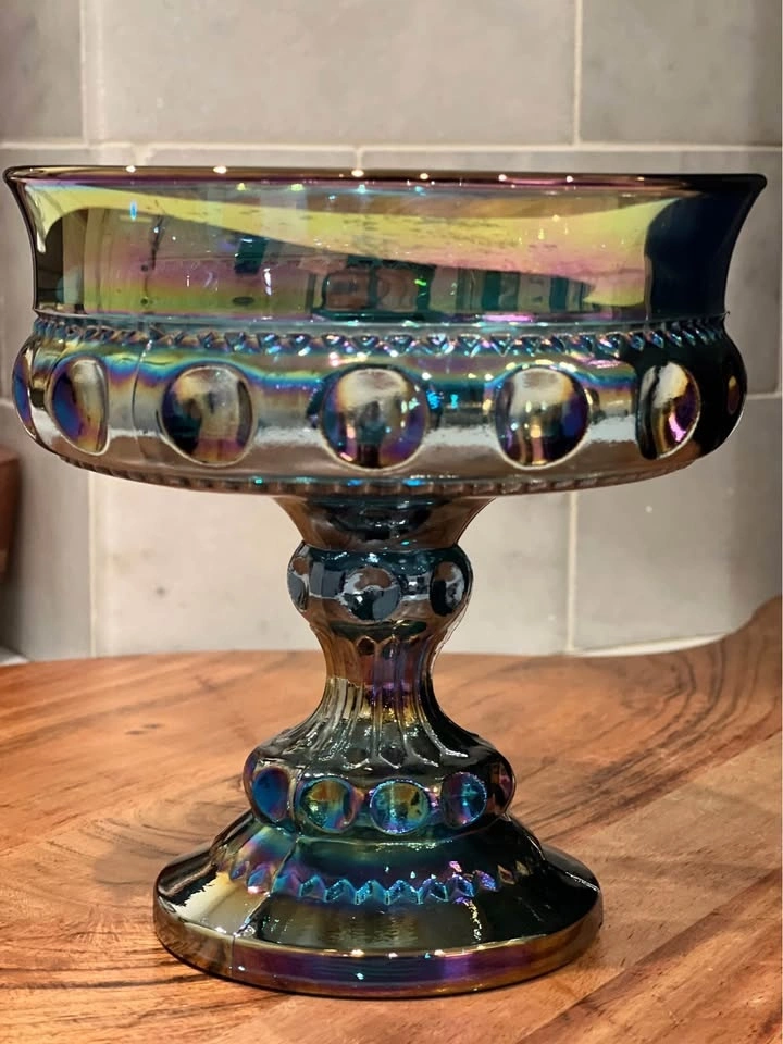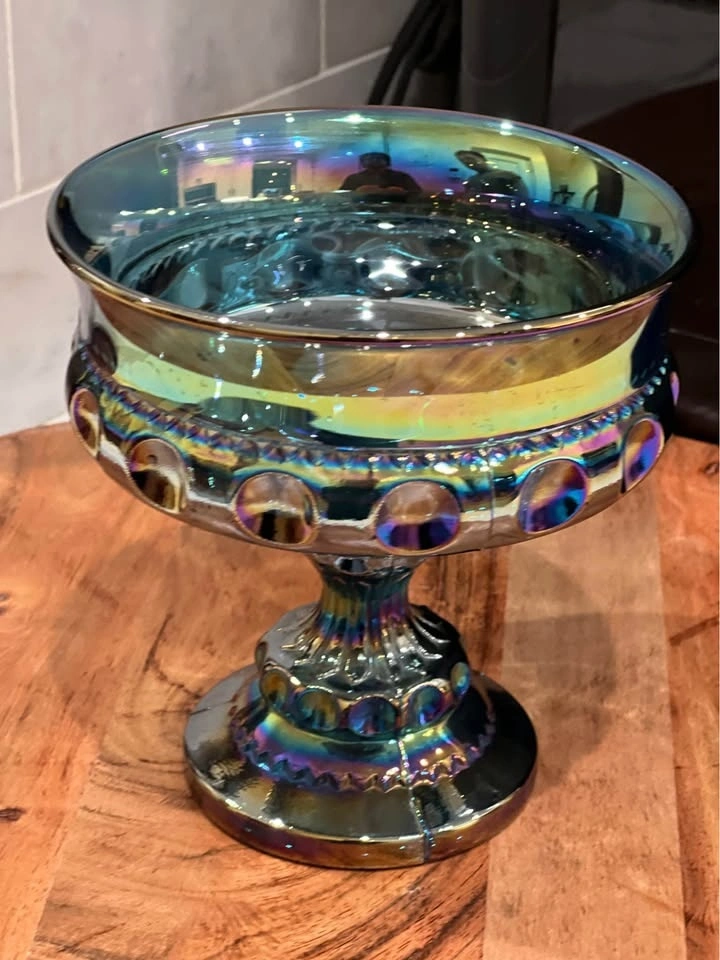 A beautiful vintage Indiana Glass “Kings Crown” thumbprint compote, crafted in shimmering blue carnival glass. Made by Indiana Glass Company in their well-loved “Kings Crown” (Thumbprint) design. Carnival glass with a vibrant iridescent finish that reflects rainbow hues under the light. Pedestal compote or candy dish, also known as a “wedding bowl,” perfect for serving treats or displaying as a centerpiece. Excellent vintage condition with no chips or cracks. Approximately 5.25" tall with a diameter of about 5". A striking collectible for carnival glass lovers, or a perfect accent piece for vintage table décor.