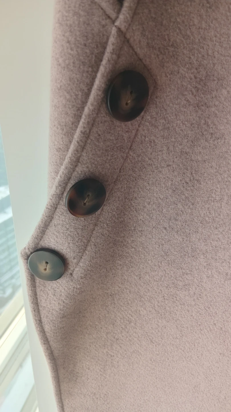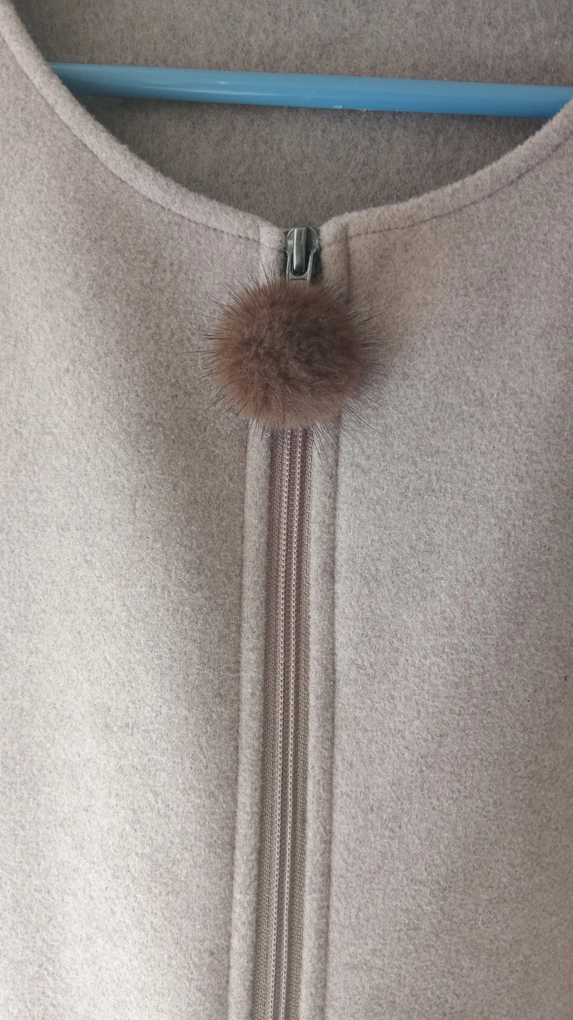 This sleeveless vest is a stylish addition to any outfit. It features decorative buttons on the sides and a unique pom-pom zipper pull. The material is soft and feels like wool or a wool blend. It's perfect for layering when you need a little extra warmth without a full jacket.