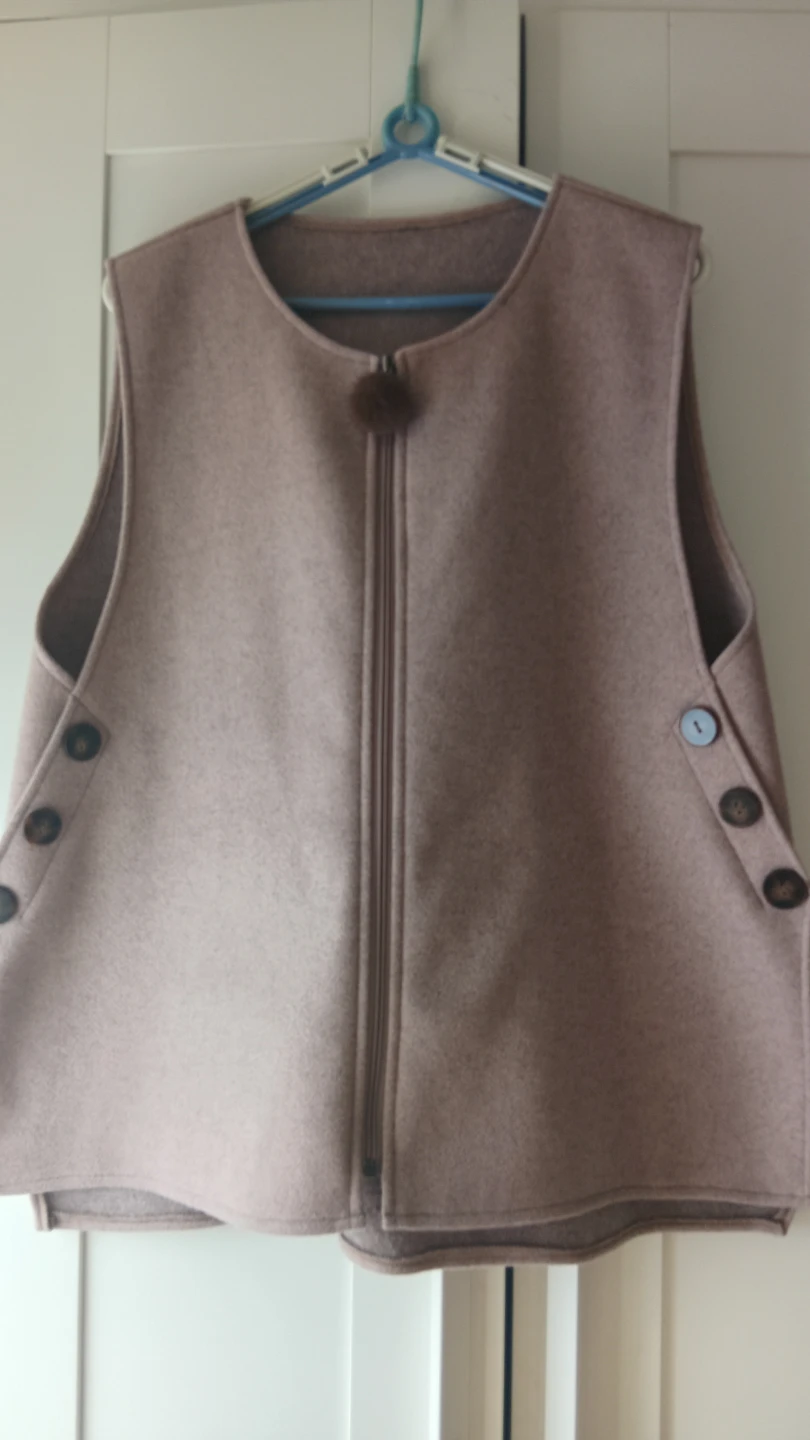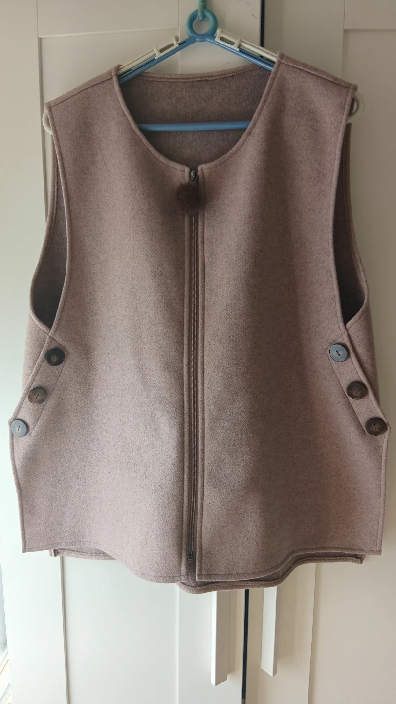 This sleeveless vest is a stylish addition to any outfit. It features decorative buttons on the sides and a unique pom-pom zipper pull. The material is soft and feels like wool or a wool blend. It's perfect for layering when you need a little extra warmth without a full jacket.