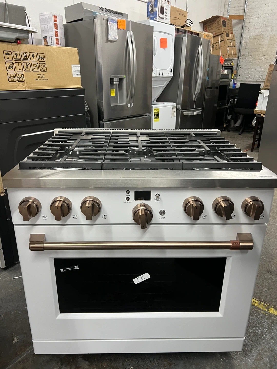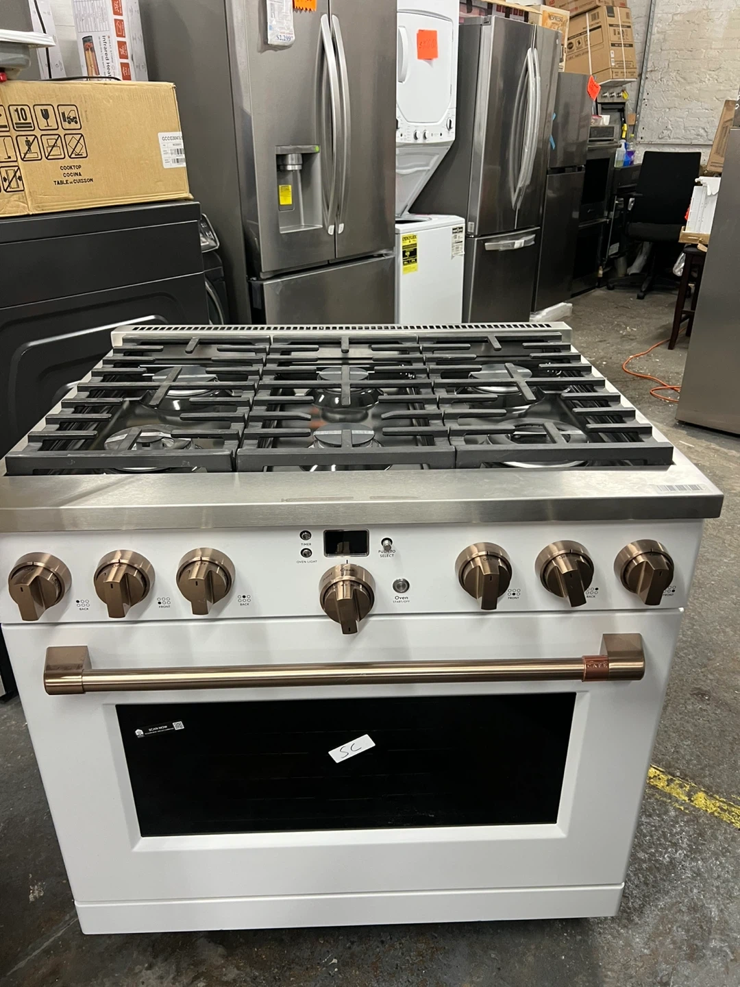 This Cafe 30" gas range features a striking matte white finish with brushed bronze hardware. It includes a spacious oven and a five-burner cooktop. Perfect for upgrading your kitchen's style and functionality!