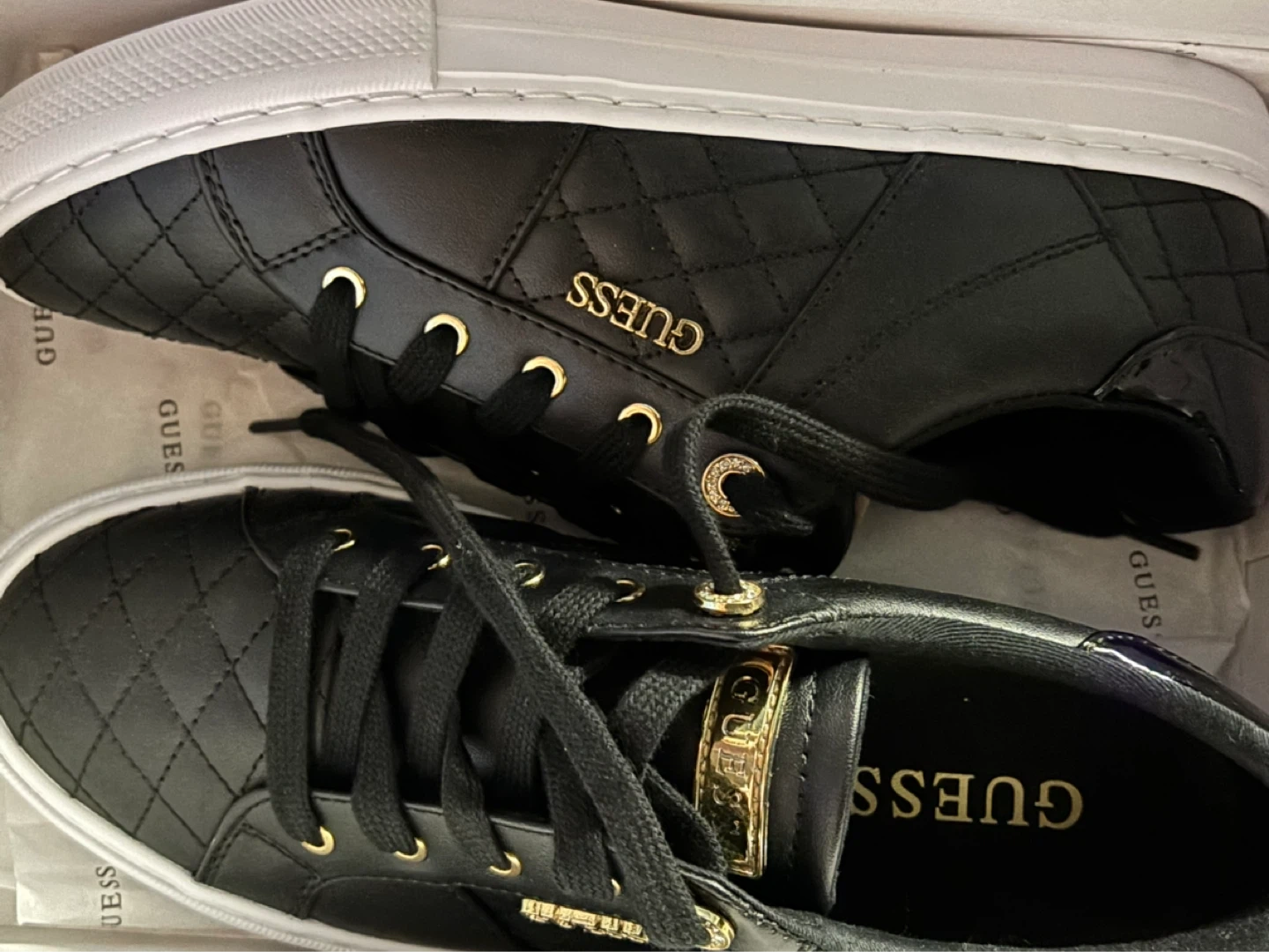 Black quilted low-top sneakers from GUESS. Features a gold-tone GUESS logo on the side and gold eyelets for laces. Size 9.5 M.
