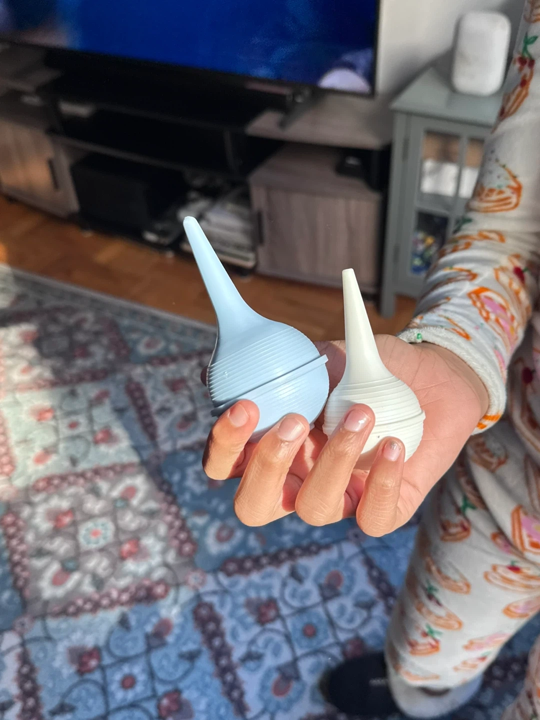 Two nasal aspirator bulbs, one blue and one white. Made of soft rubber or silicone material. These are essential for clearing congestion in infants. Gentle and easy to use for quick relief!