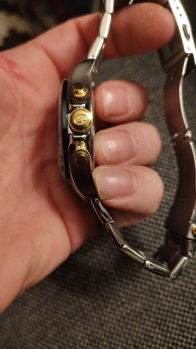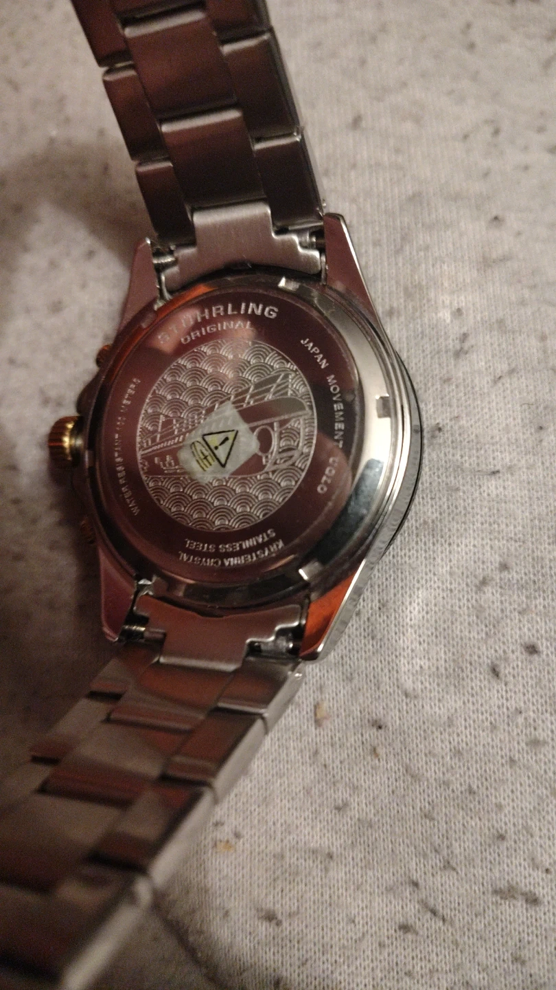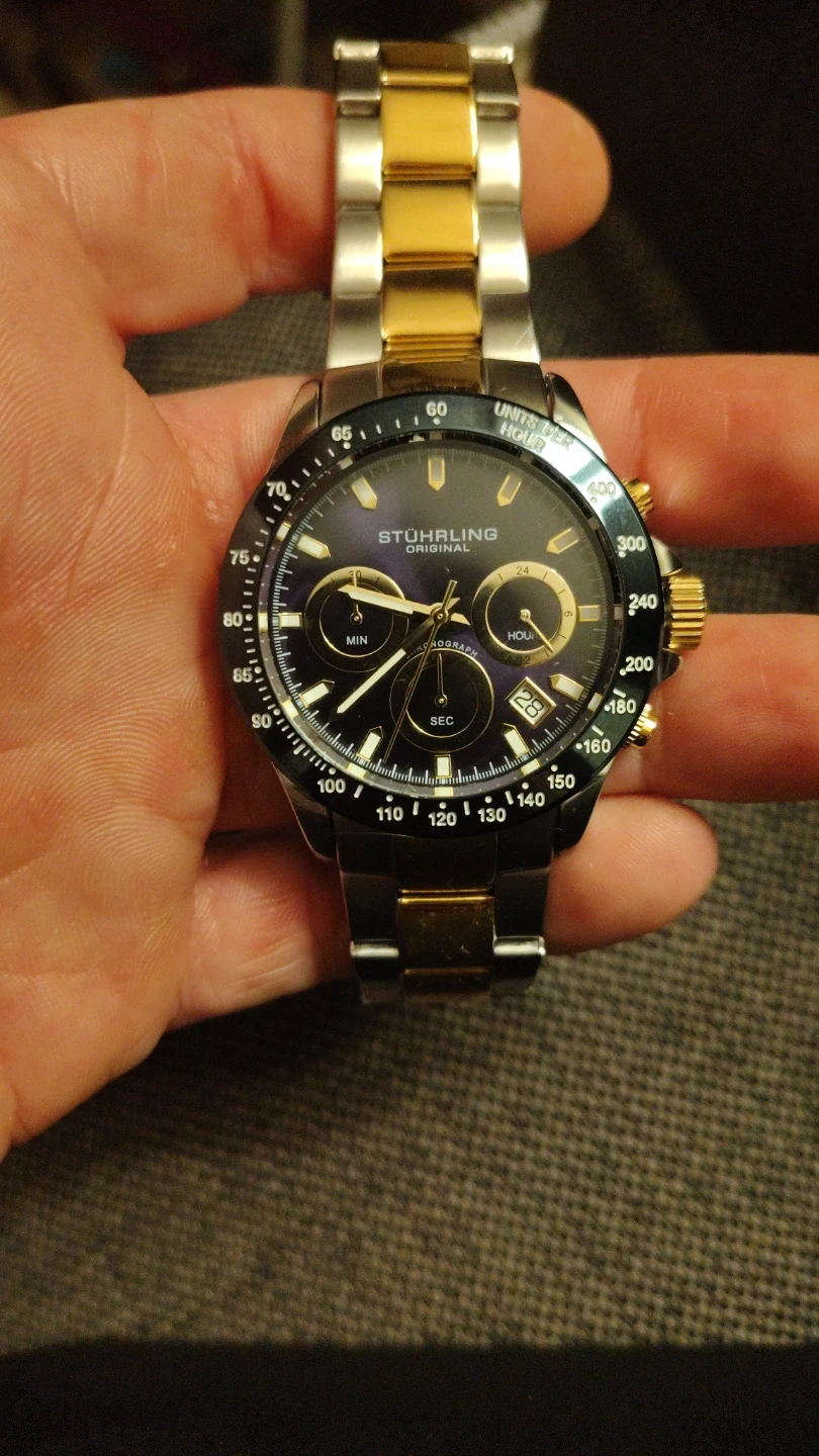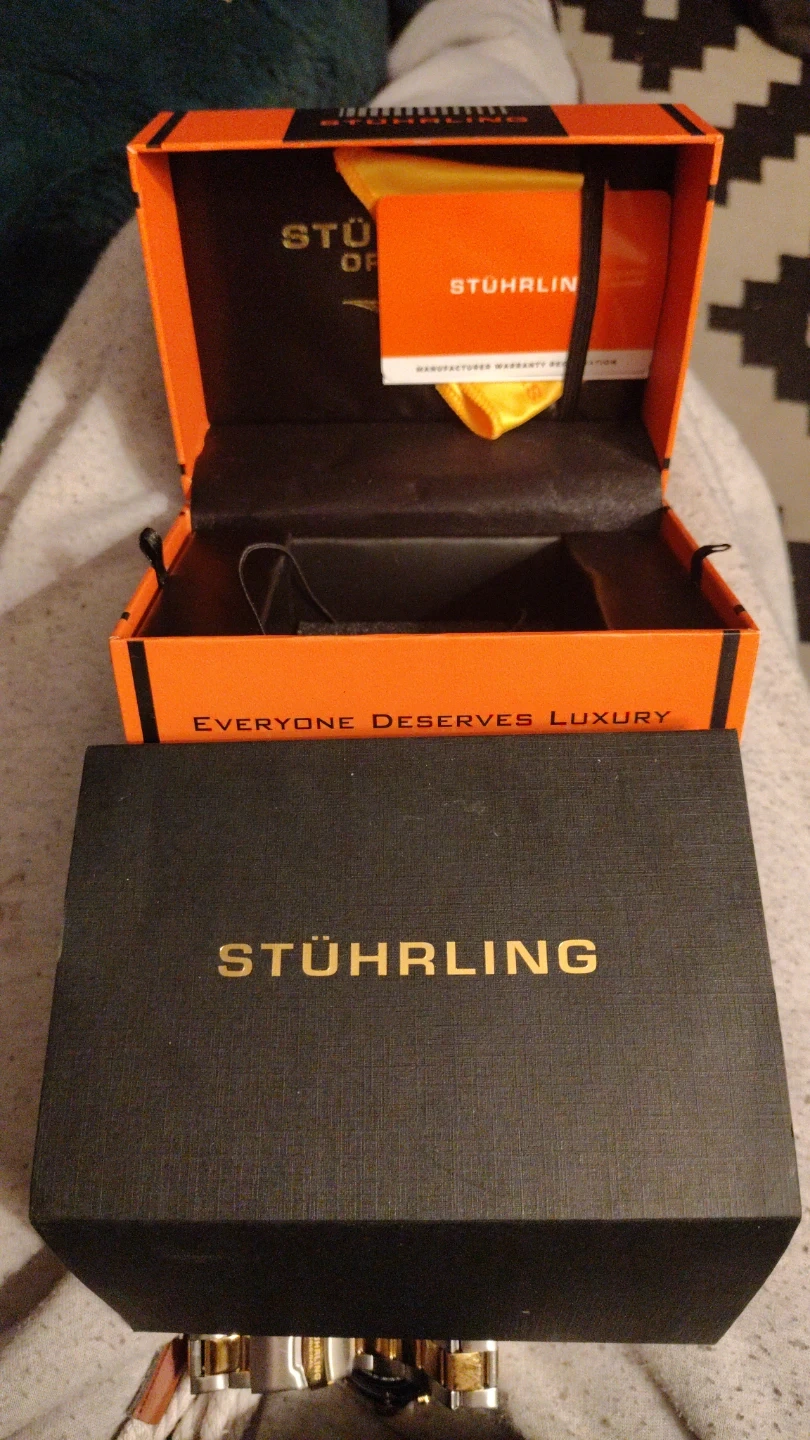 This Stuhrling Original watch features a stainless steel and gold-tone band with a Japanese movement. It includes the original box and extra links. It's a nice timepiece with a sophisticated look.