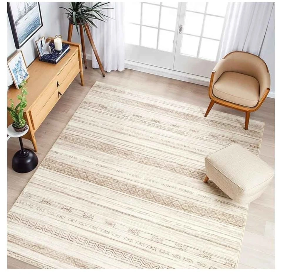 Brand new, ultra soft floor carpet for indoor home or office use. Neutral bohemian, Moroccan, farmhouse, geometric design in brown and beige.
