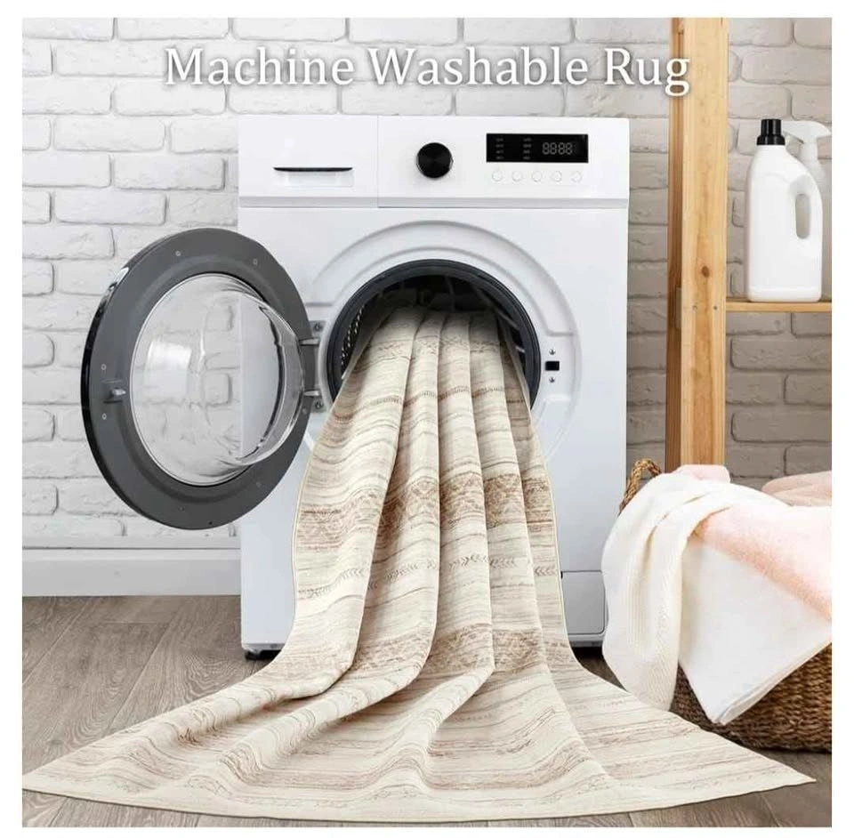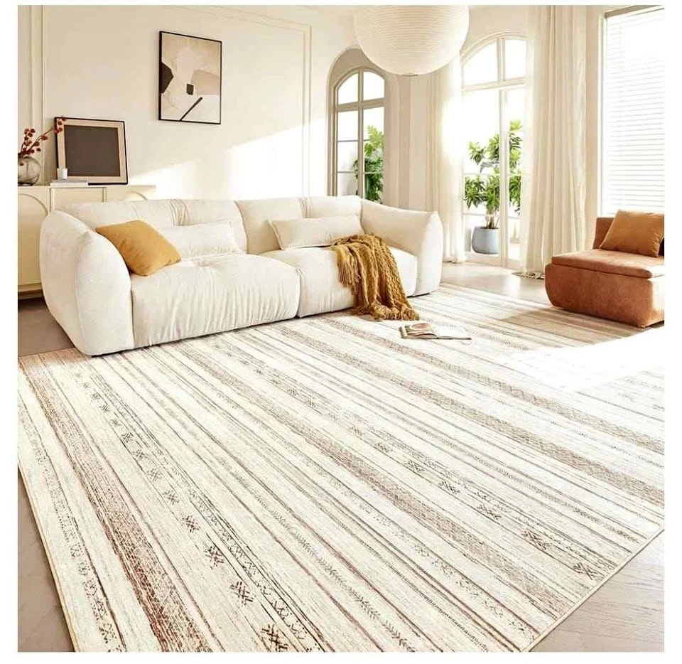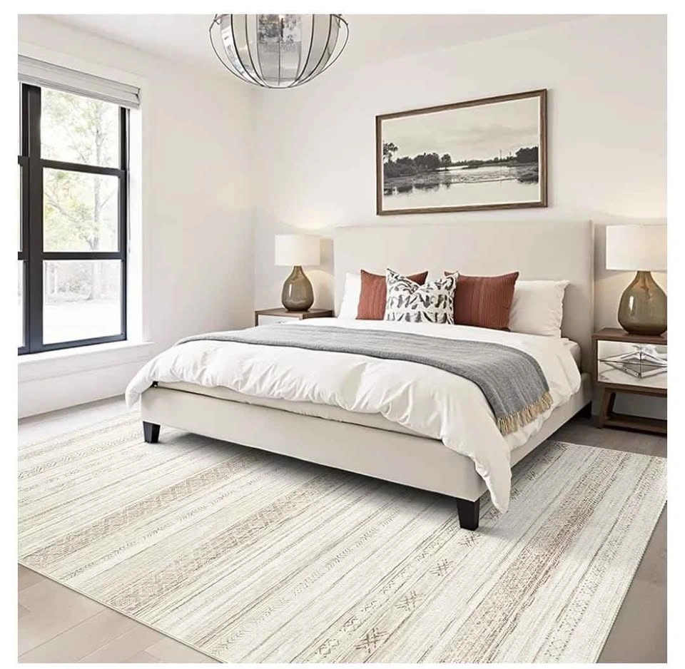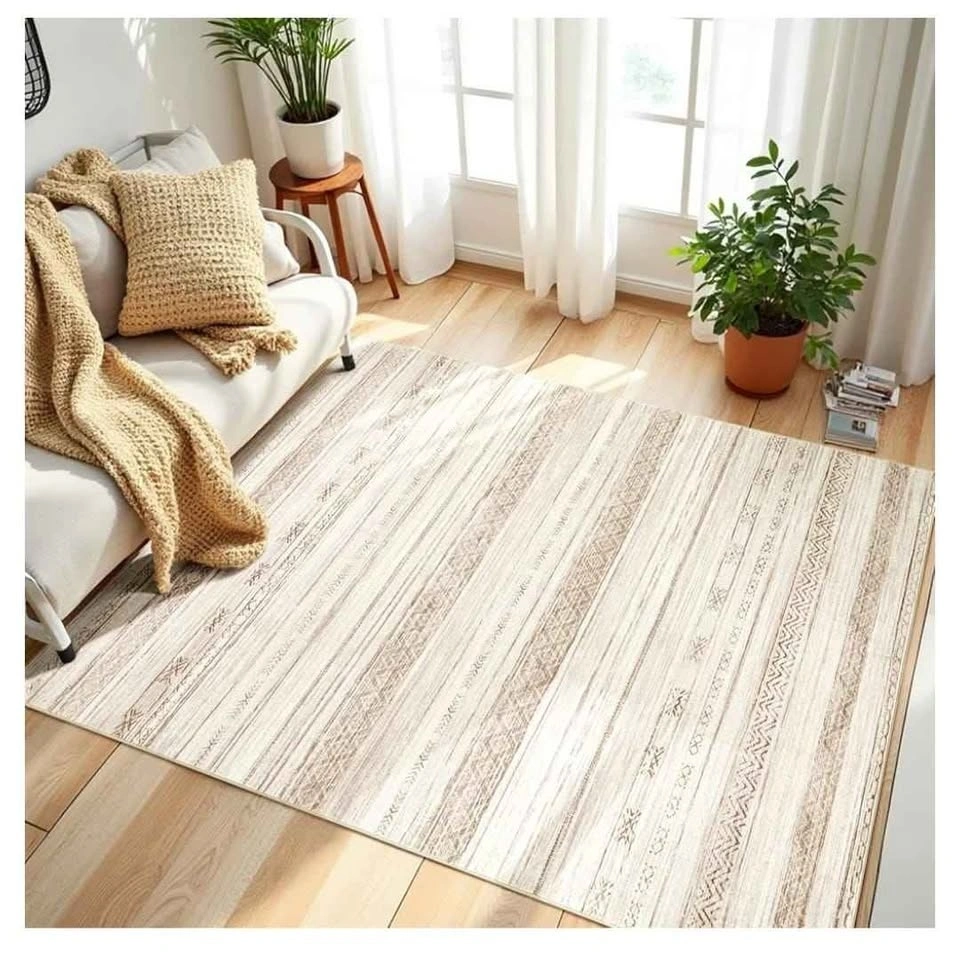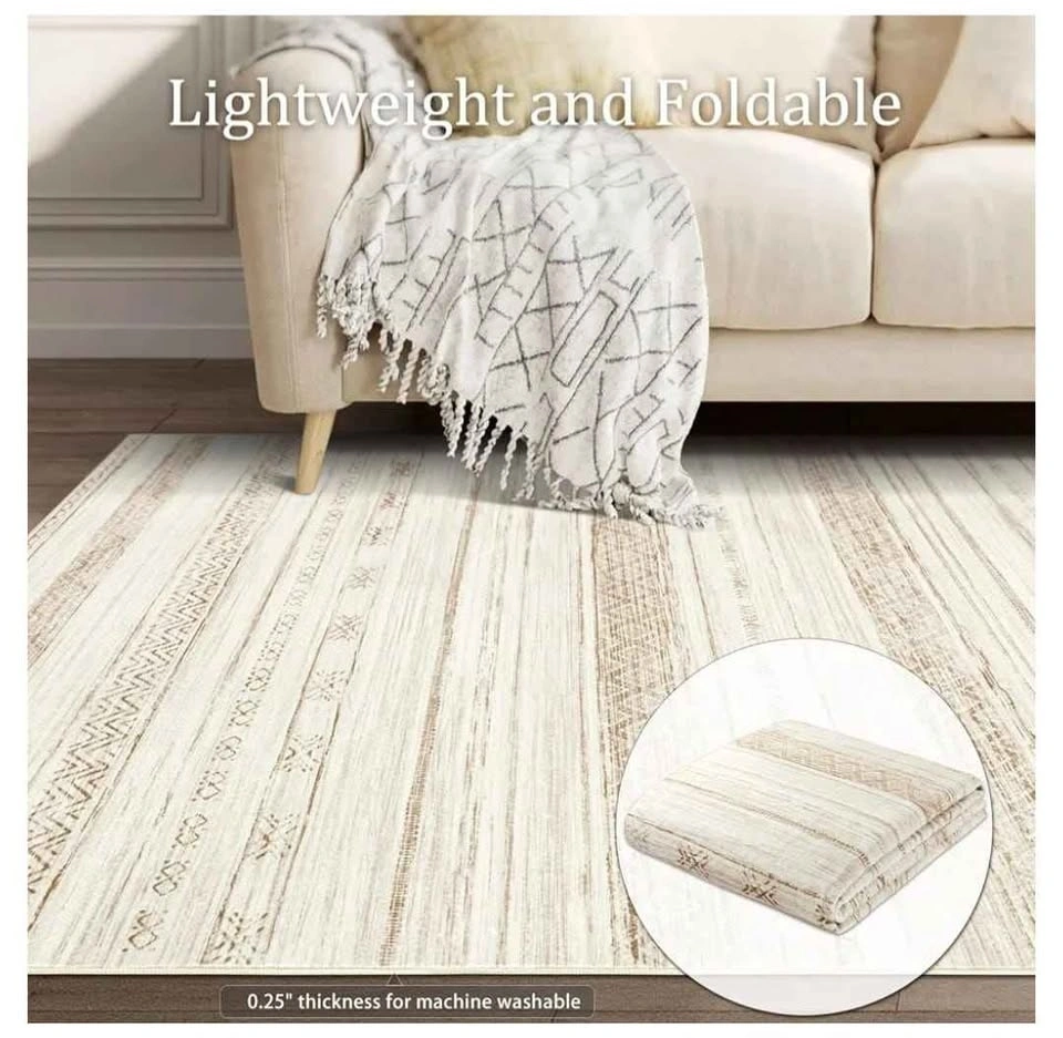 Brand new, ultra soft floor carpet for indoor home or office use. Neutral bohemian, Moroccan, farmhouse, geometric design in brown and beige.