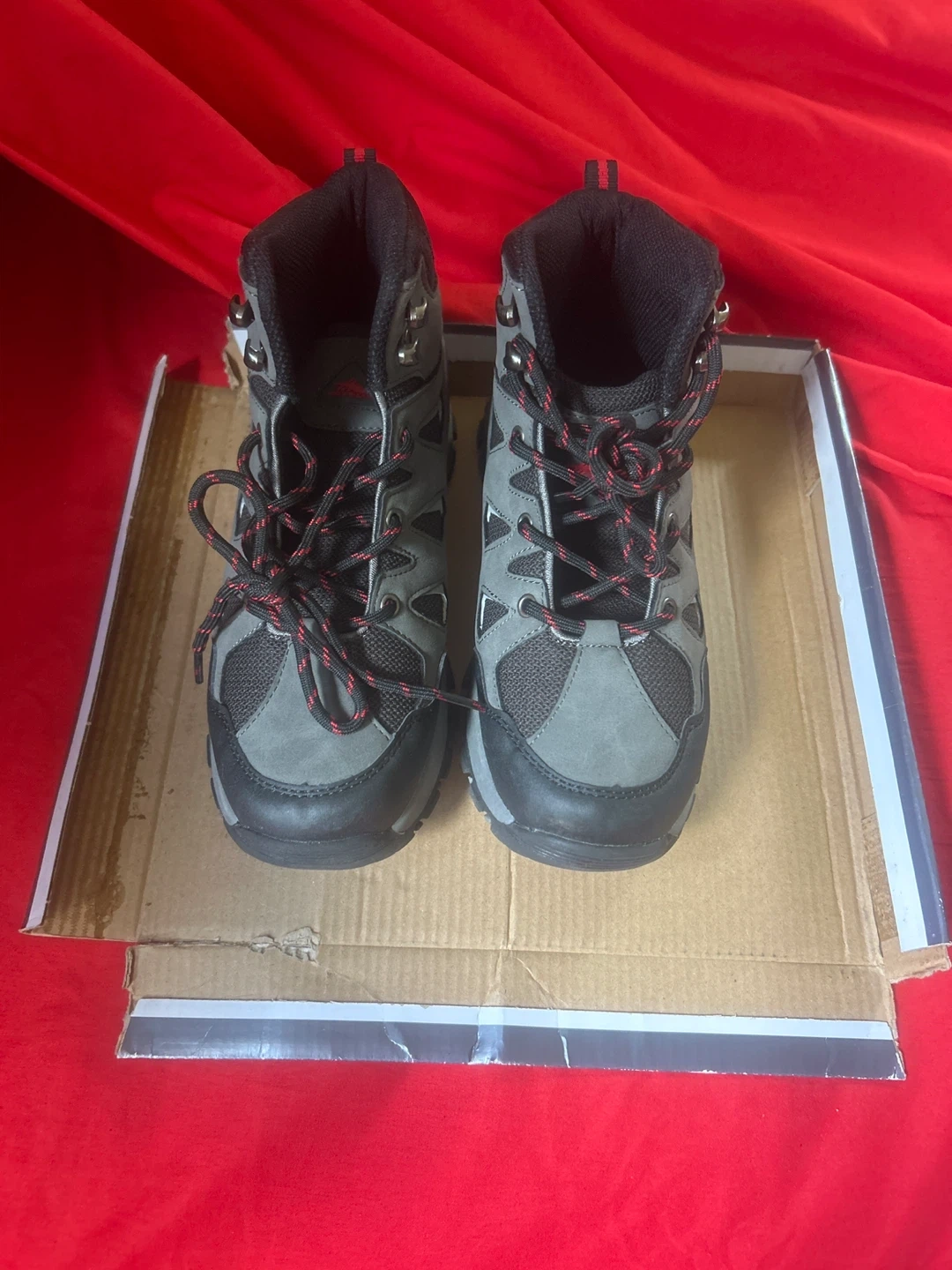 Selling a pair of gray hiking boots. They come with the box! But the box is in bad condition. Great for outdoor adventures and hiking trails only worn once.