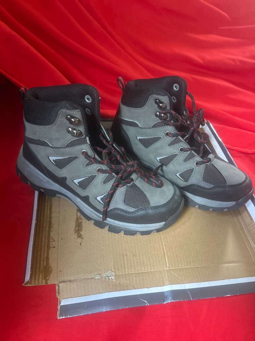 Selling a pair of gray hiking boots. They come with the box! But the box is in bad condition. Great for outdoor adventures and hiking trails only worn once.