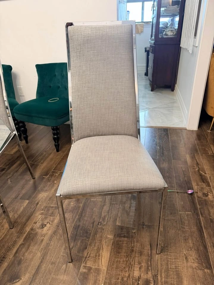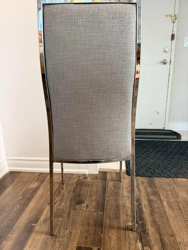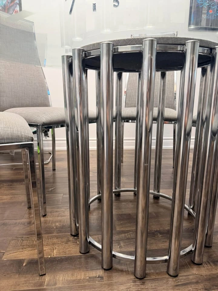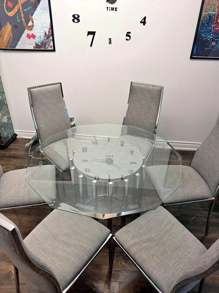 Excellent condition! Modern dining set has octagonal tempered glass tabletop with polished chrome pedestal base. Set includes six high-back chairs upholstered in grey textured fabric with sleek chrome frames. Minimalist design with clean lines and reflective surfaces. Dimension: 48 inches by 48 inches edge to edge.