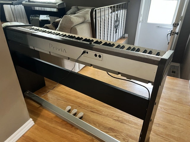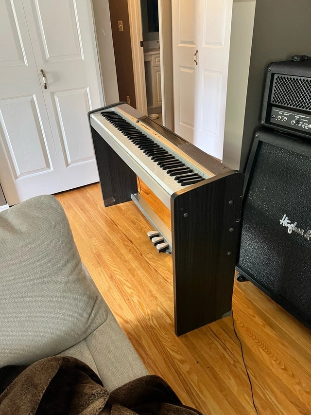 Casio PX-120 88-key digital piano. There's a bit of damage on the speaker cloth, which is reflected in the price (it still works and sounds like new). Includes a sturdy matching stand and a triple pedal unit for full expressive control—ideal for students, hobbyists, or anyone looking for a quality digital piano with a realistic feel. Features: 88 full-size, weighted keys with scaled hammer action, Dual and Layer modes, 11 built-in tones, reverb/chorus effects, built-in metronome and song recorder, integrated speakers, triple pedal unit (soft, sostenuto, and sustain), and a sleek, compact design. What’s Included: Casio PX-120 Digital Piano, Matching Stand, Triple Pedal Unit, Power Adapter. Perfect for beginners and experienced players alike. Everything is set up and ready to play—just plug in and go!