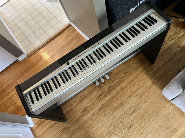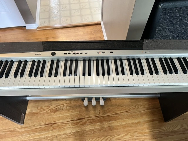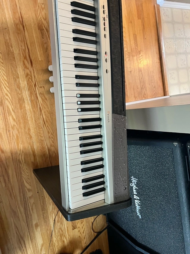 Casio PX-120 88-key digital piano. There's a bit of damage on the speaker cloth, which is reflected in the price (it still works and sounds like new). Includes a sturdy matching stand and a triple pedal unit for full expressive control—ideal for students, hobbyists, or anyone looking for a quality digital piano with a realistic feel. Features: 88 full-size, weighted keys with scaled hammer action, Dual and Layer modes, 11 built-in tones, reverb/chorus effects, built-in metronome and song recorder, integrated speakers, triple pedal unit (soft, sostenuto, and sustain), and a sleek, compact design. What’s Included: Casio PX-120 Digital Piano, Matching Stand, Triple Pedal Unit, Power Adapter. Perfect for beginners and experienced players alike. Everything is set up and ready to play—just plug in and go!
