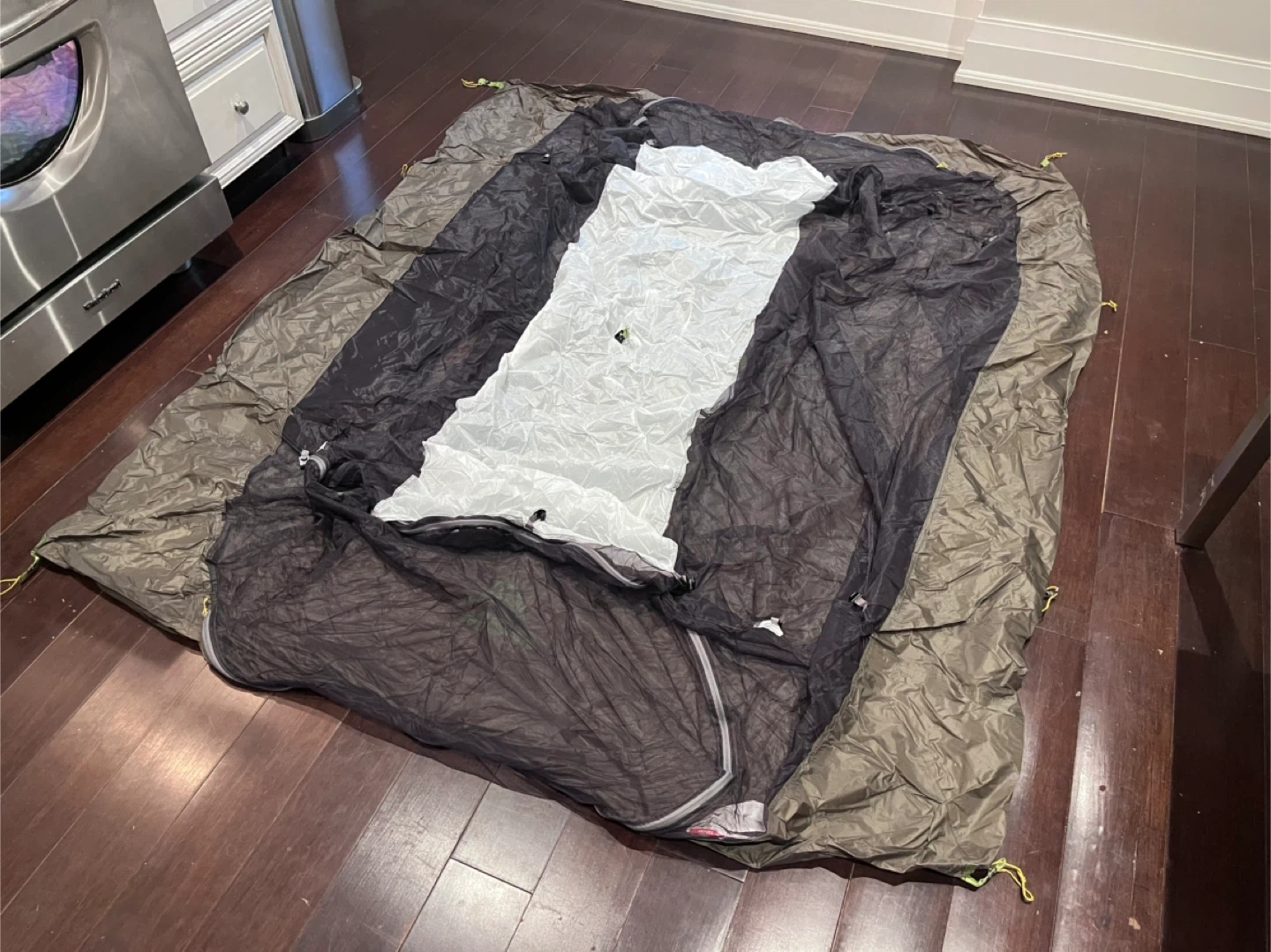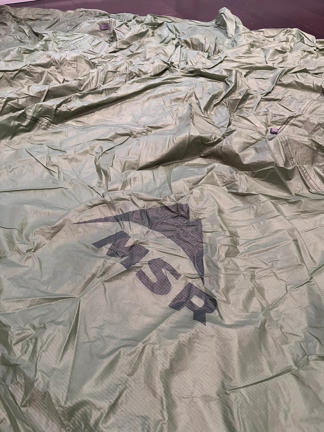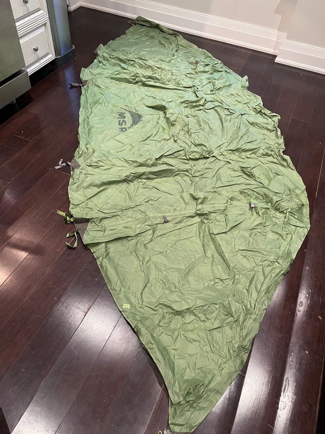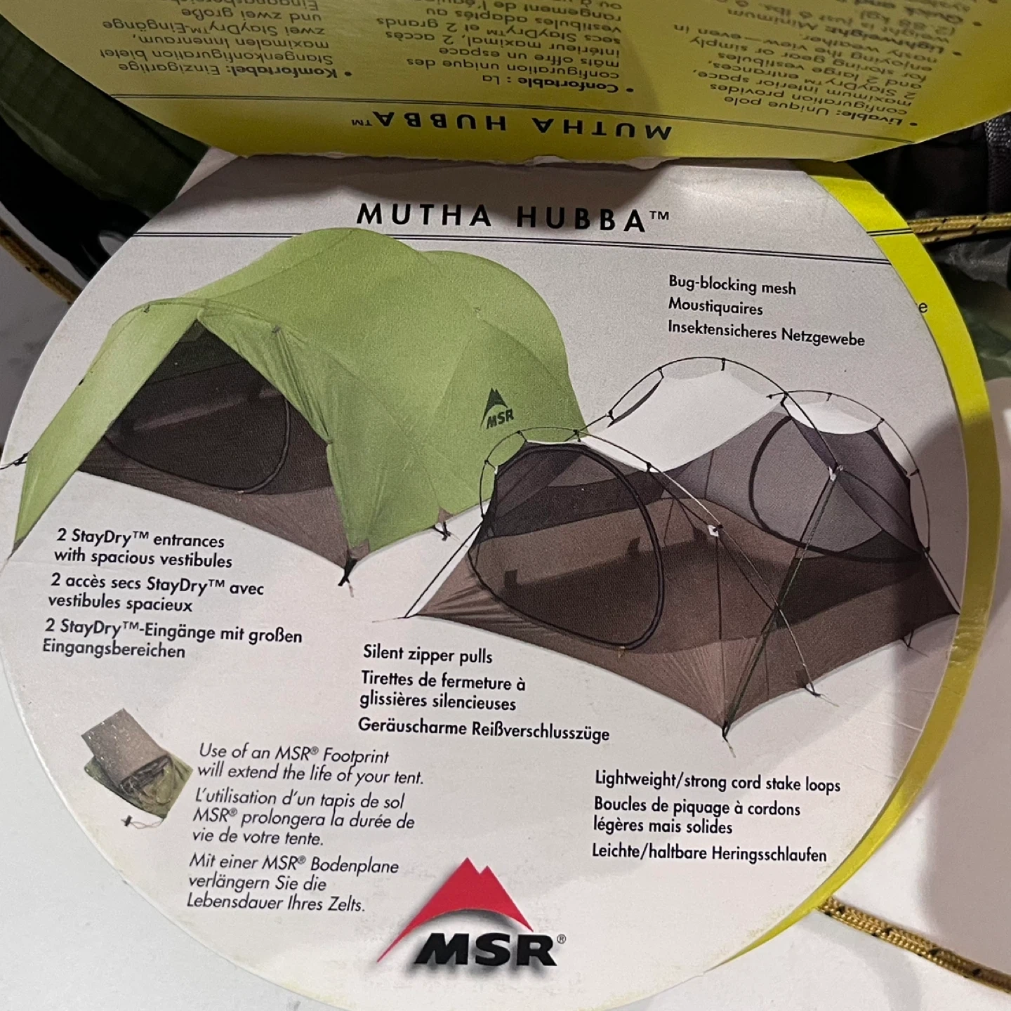 MSR Mutha Hubba three-person, two-door, dual-vestibule, three-season tent. Experience Series. Comfortably fits two people. Gently used on one previous camping trip. No rips or tears, zippers working, footprint and stakes included. Admittedly, the inner seals on the stitching for the outer shell is somewhat deteriorated but I believe they can be resealed if desired (see last photos). Could use some time to off-gas before use, as it has been packed away for a while.