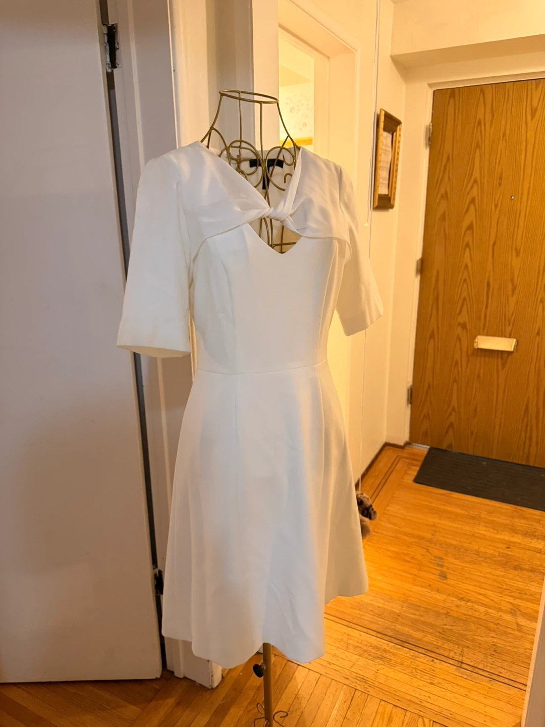 Never worn. Elegant white BCBGMAXAZRIA dress with a stylish twist front detail. Short sleeves and a flattering silhouette. Size 04.