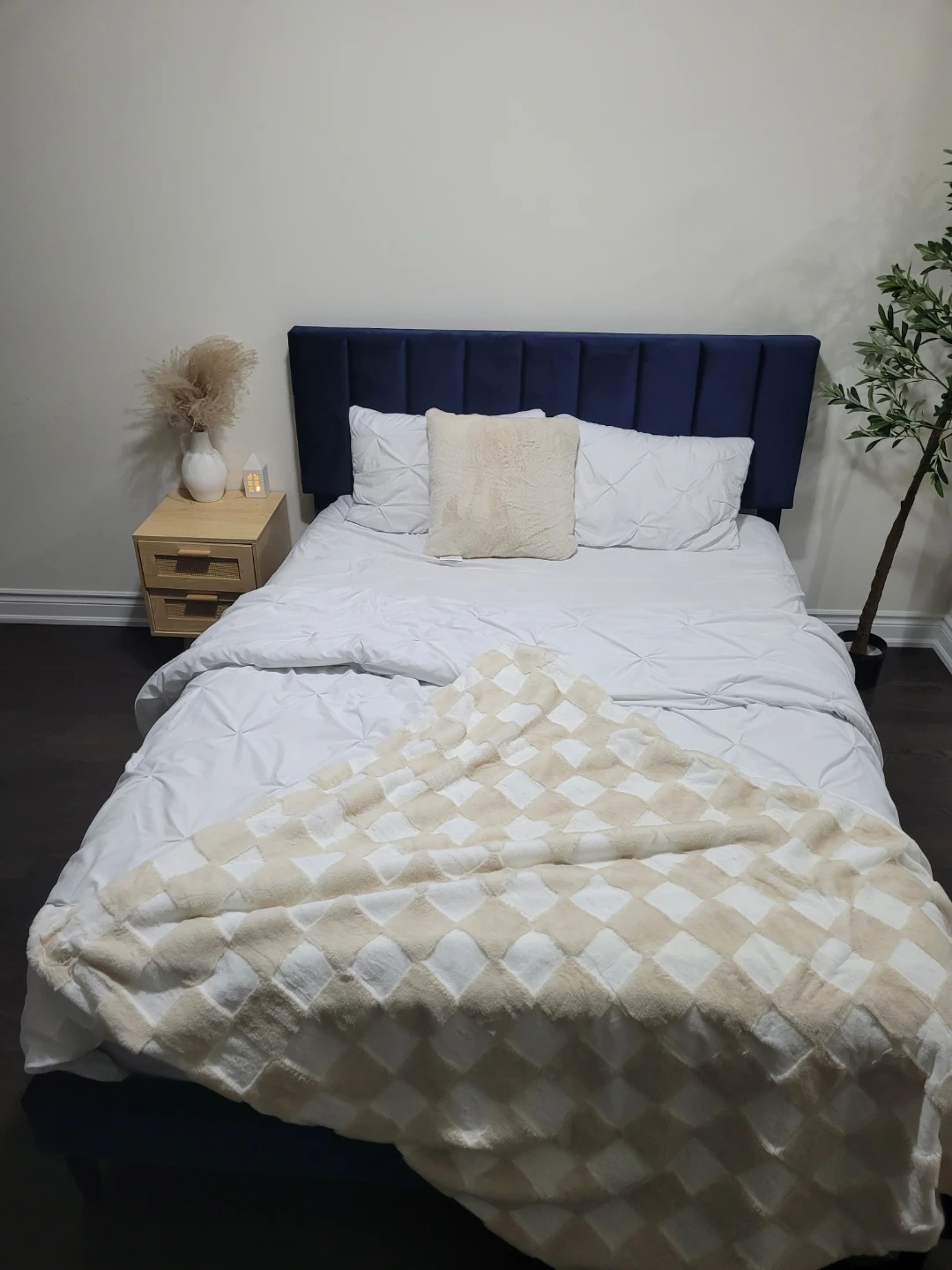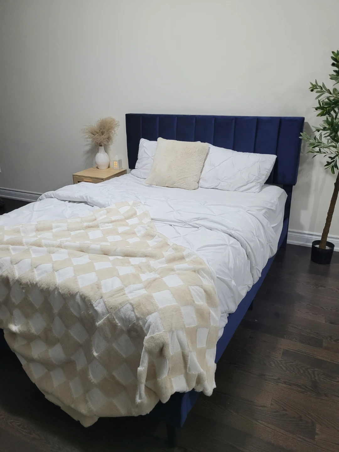 Upholstered queen bed frame in a deep blue velvet. Features a stylish, padded headboard with vertical channel tufting. Sturdy construction for a comfortable night's sleep.