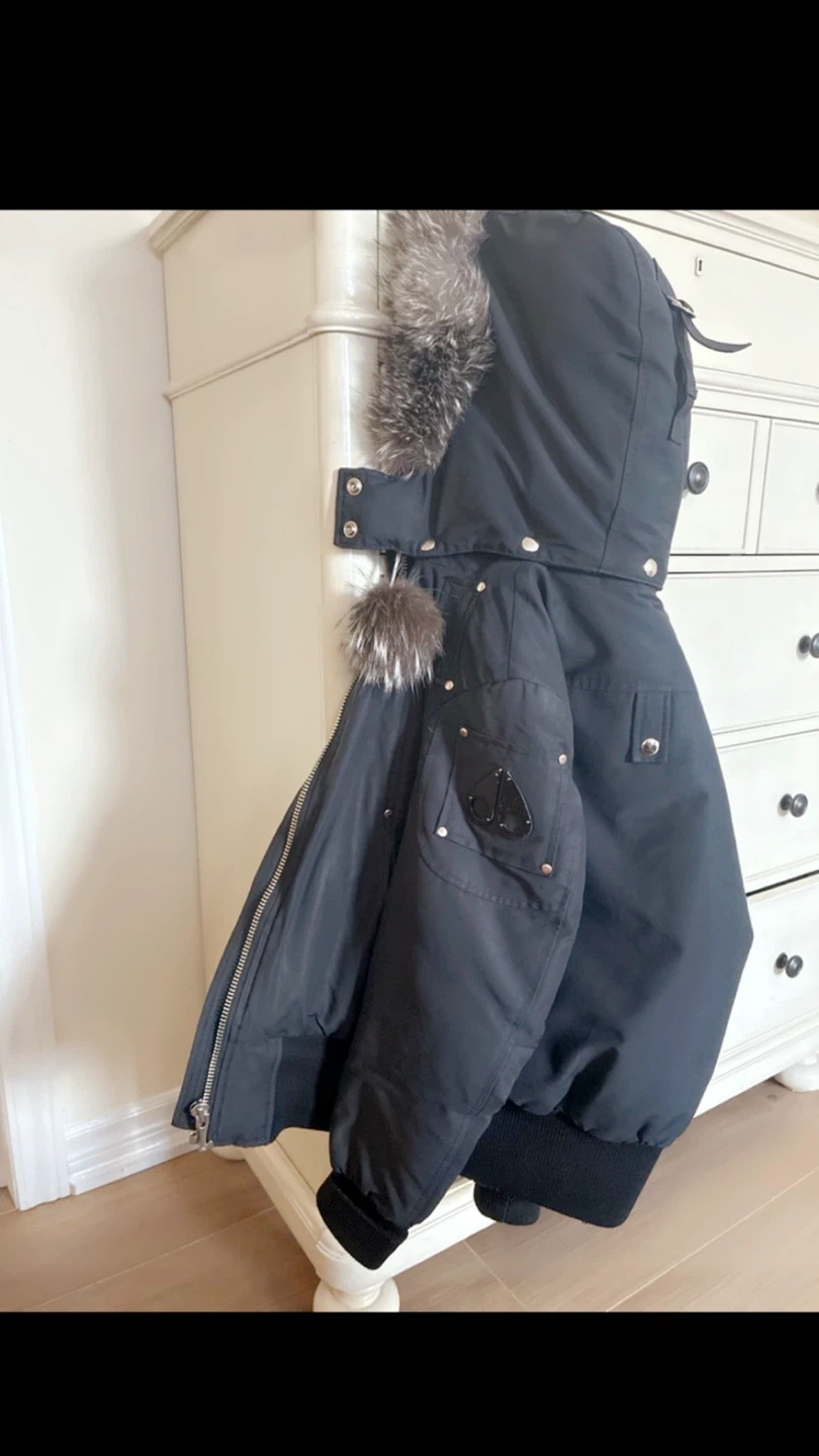 A black Moose Knuckles bomber jacket with a fur-lined hood. It features a zippered closure and ribbed cuffs and hem. Includes the signature Moose Knuckles logo on the sleeve.
