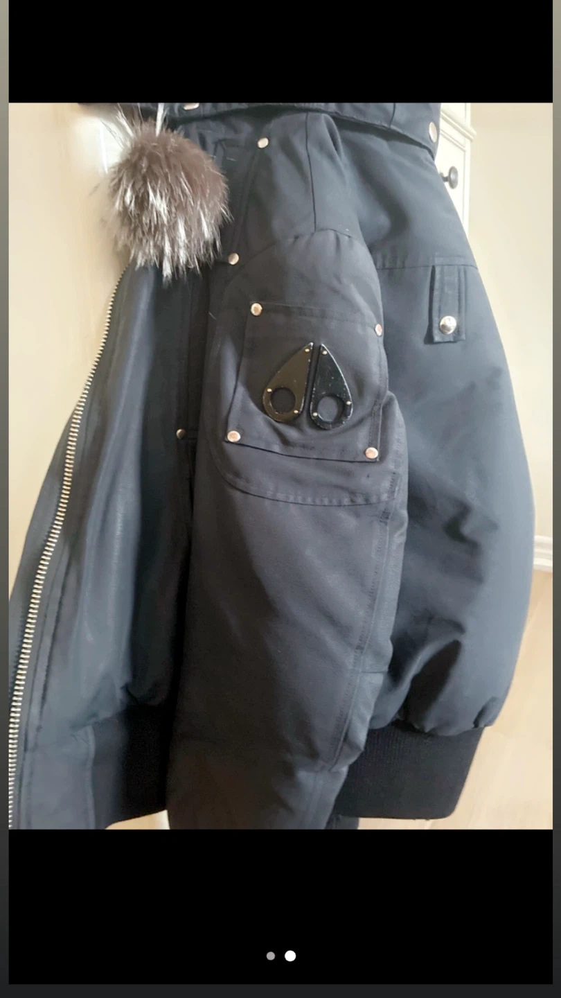 A black Moose Knuckles bomber jacket with a fur-lined hood. It features a zippered closure and ribbed cuffs and hem. Includes the signature Moose Knuckles logo on the sleeve.
