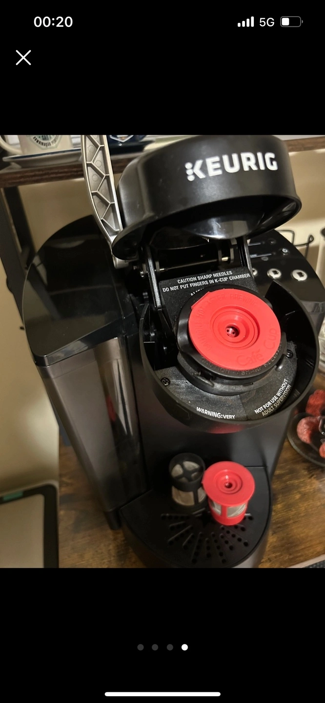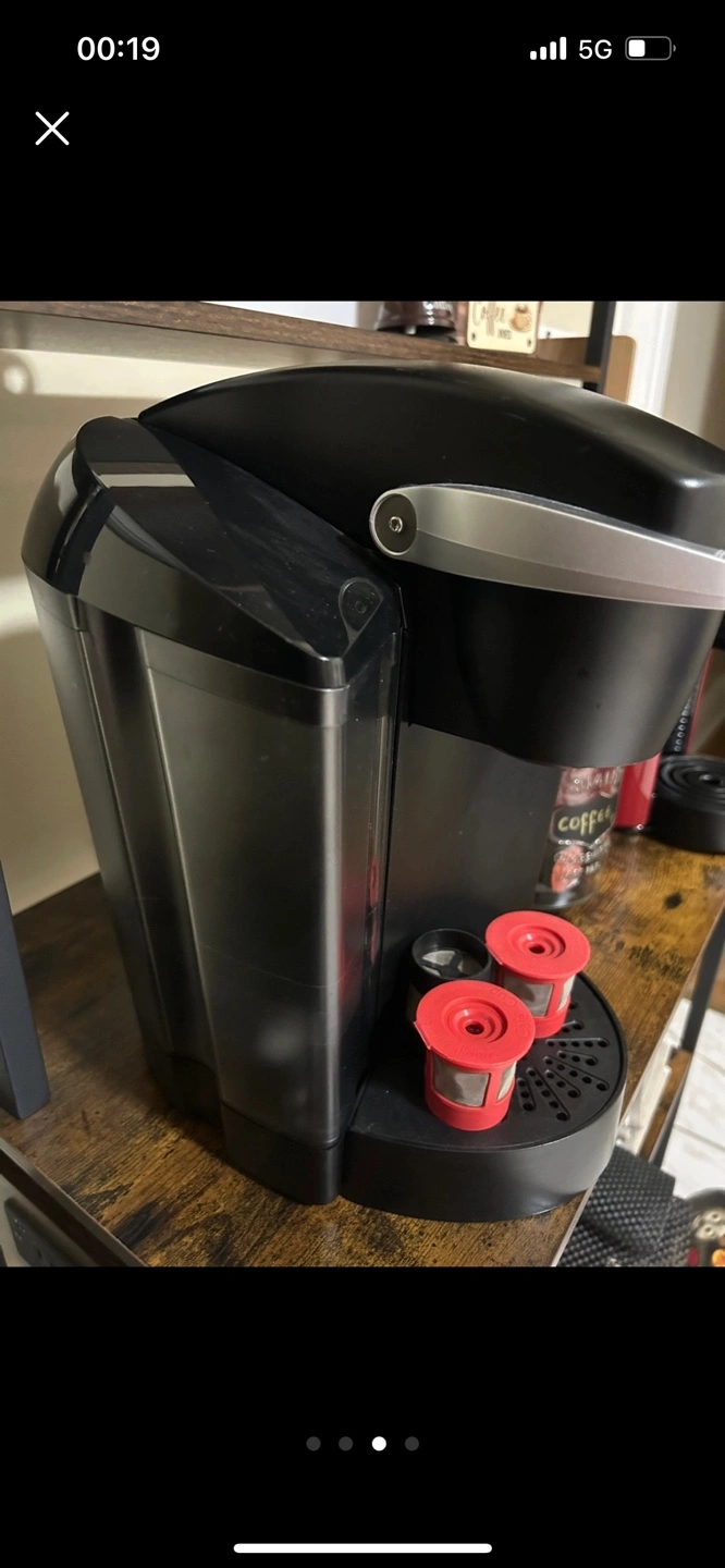 Black Keurig coffee maker. Makes single-serve cups of coffee. Includes tree reusable filters. Good condition.