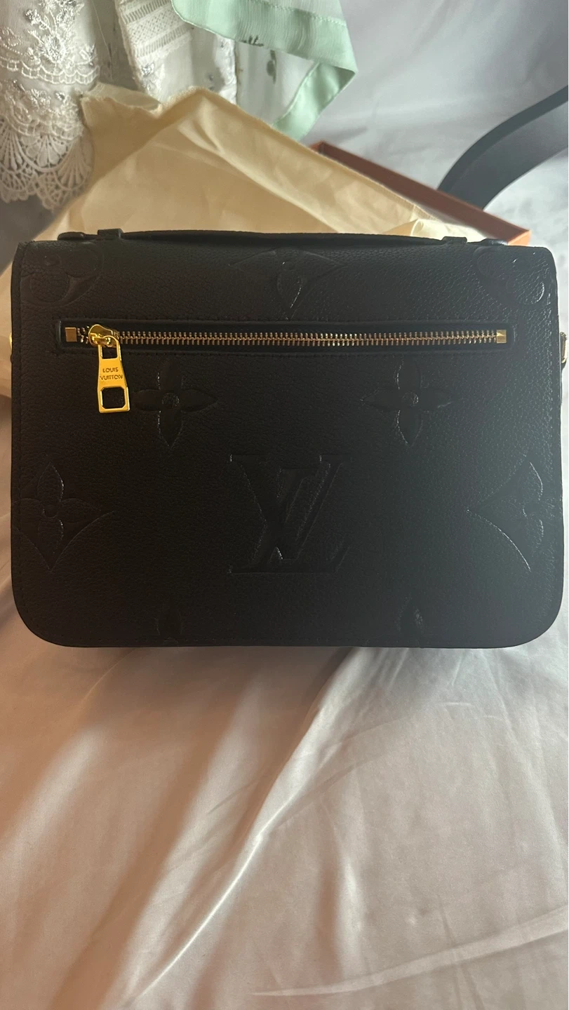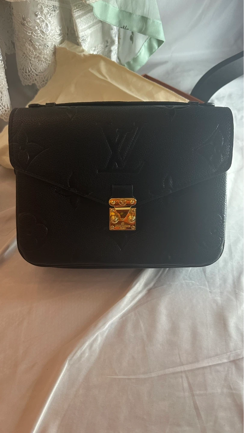 This is a Louis Vuitton black leather shoulder bag with an embossed monogram pattern. It comes with a detachable strap and includes the dust bag and box, with the paperwork of the bag.