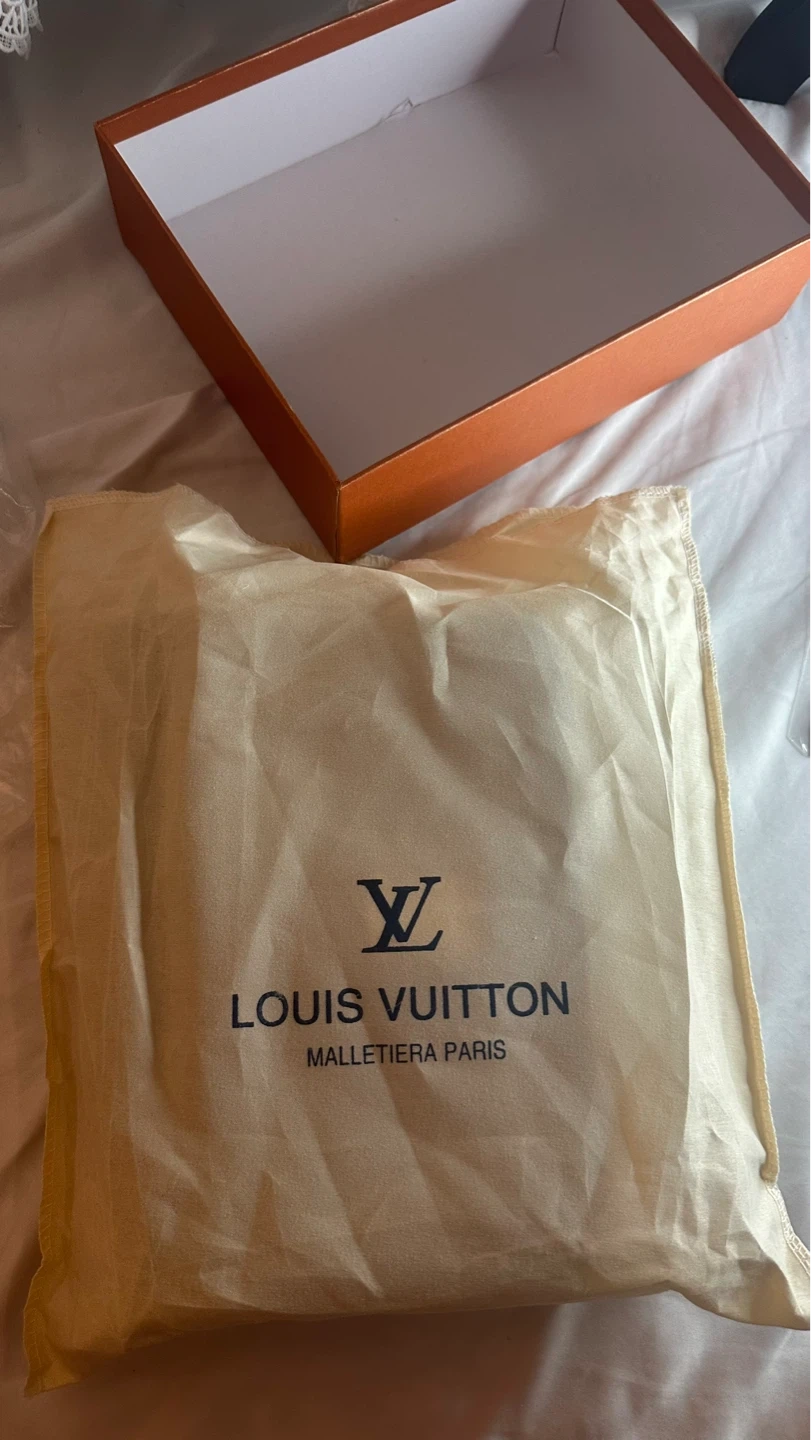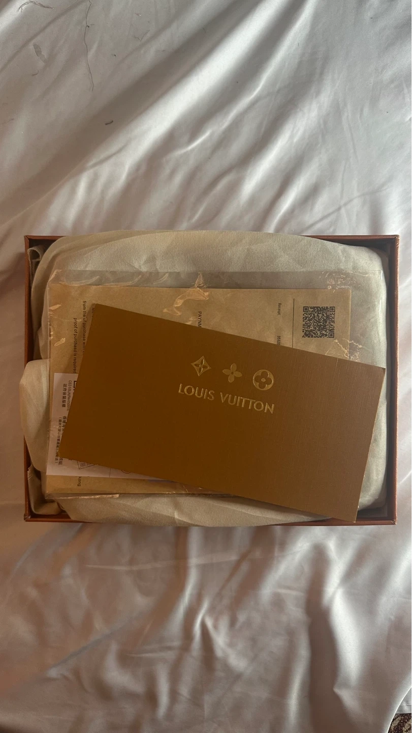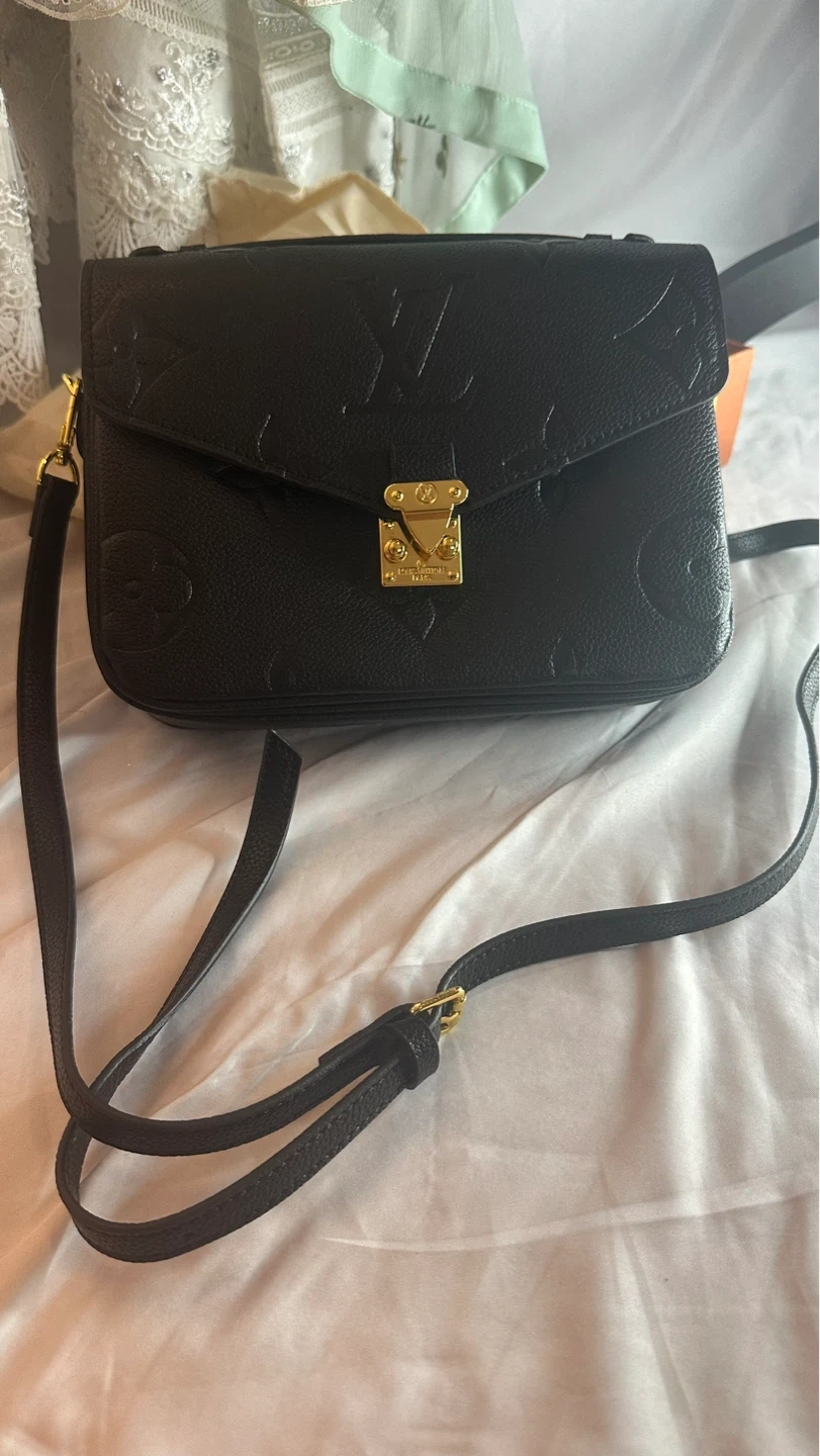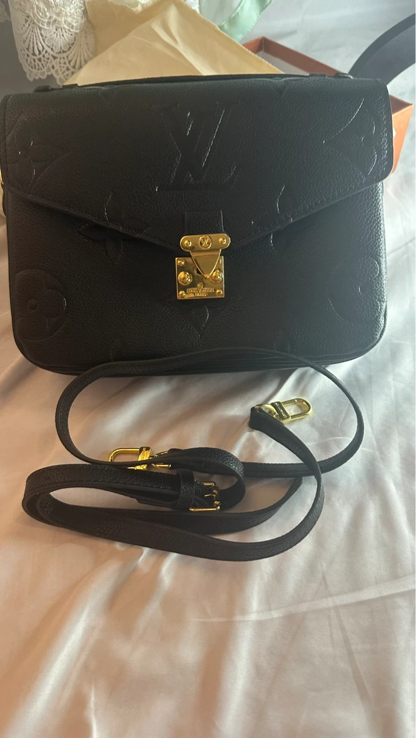 This is a Louis Vuitton black leather shoulder bag with an embossed monogram pattern. It comes with a detachable strap and includes the dust bag and box, with the paperwork of the bag.