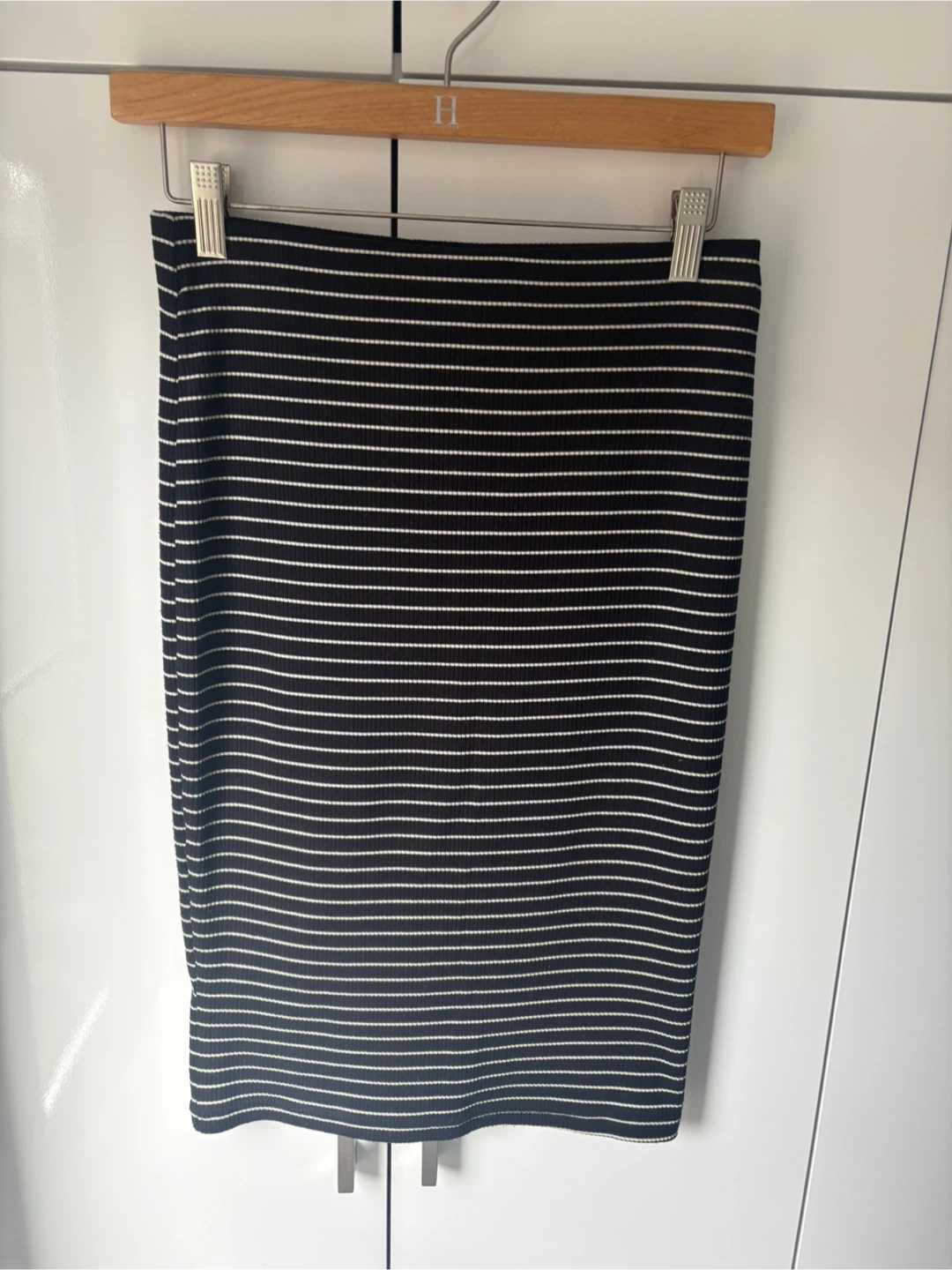 This is a black and white striped pencil skirt. It's a stretchy, ribbed material. This skirt is great for dressing up or down!