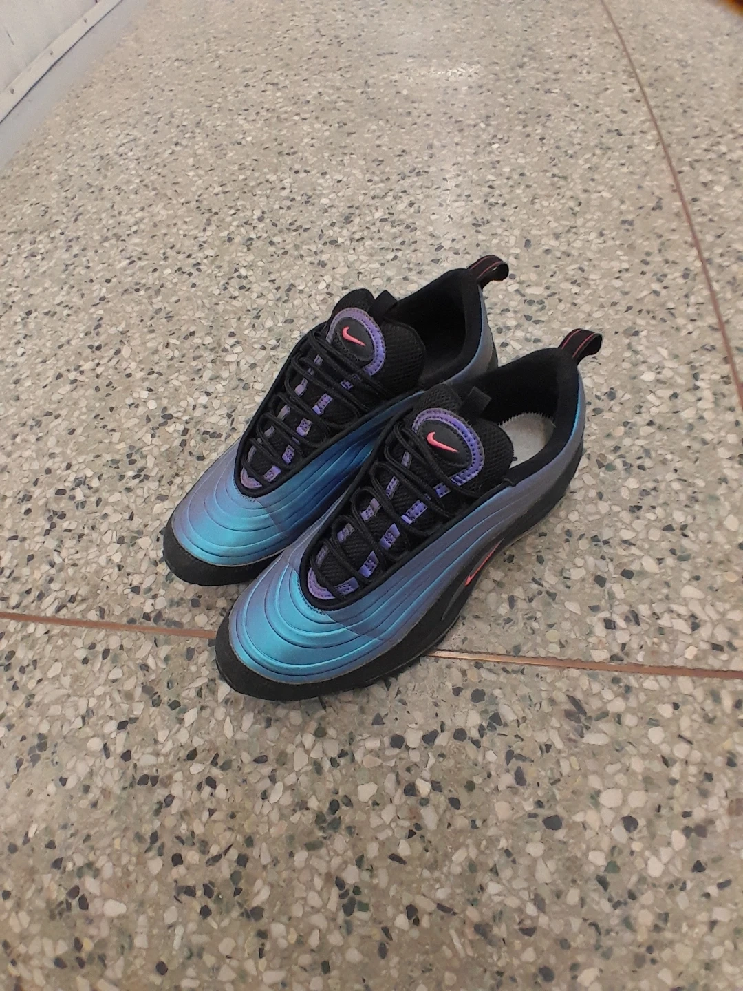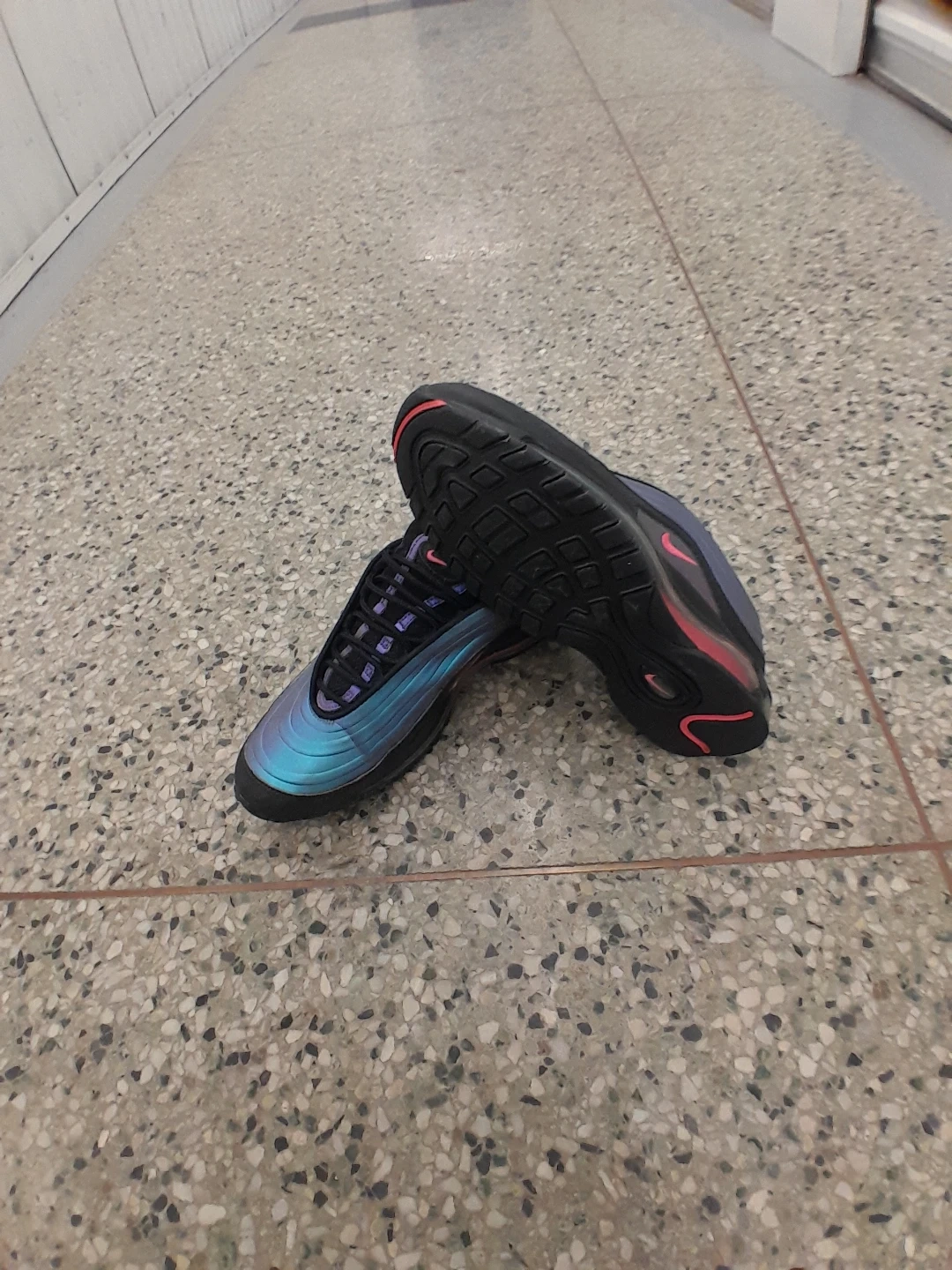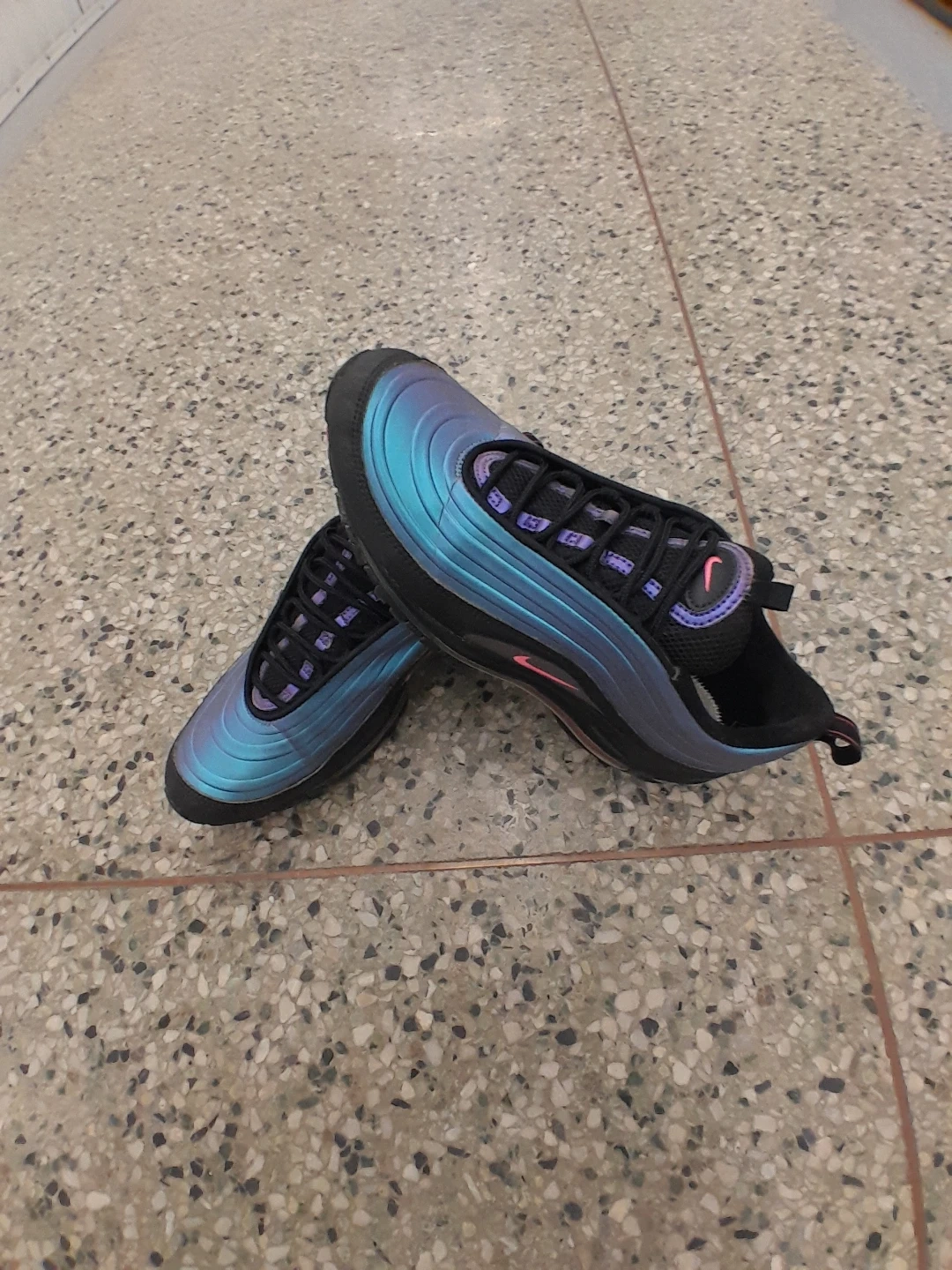 Nike Air Max 97 shoes feature a distinctive "Tear Drop" design with a shimmering blue and purple iridescent upper and black accents. They have a comfortable lace-up closure and the iconic Air Max cushioning. Perfect for adding a unique flair to your streetwear look! Women's size 9