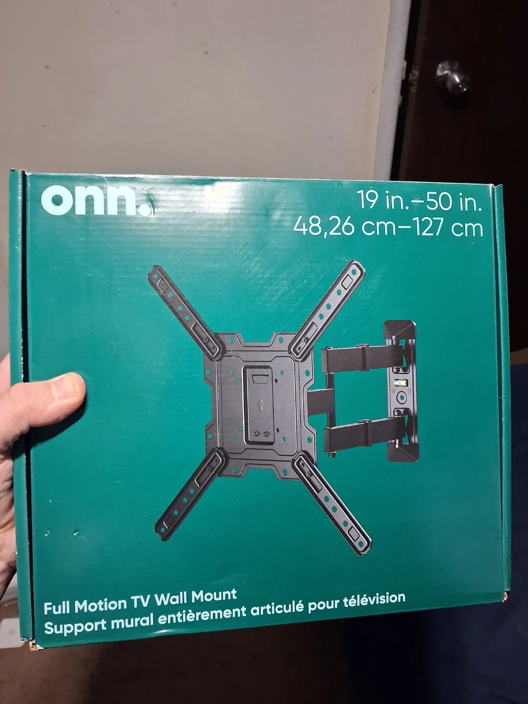 This is an Onn. full motion TV wall mount. It's designed for TVs from 19 to 50 inches, or 48.26 to 127 cm. The mount allows for full motion adjustability.