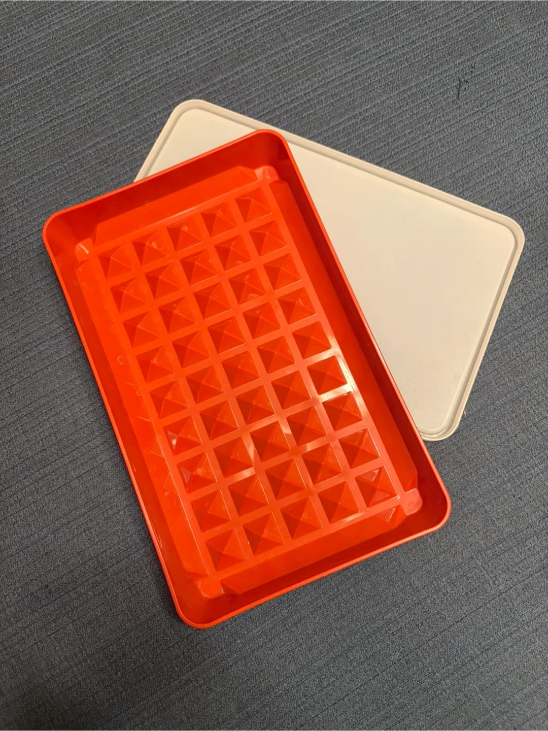 Vintage Tupperware marinating tray with red pyramid base and matching lid. The raised pyramid design helps drain and separate liquids, making it great for marinating meats or storing bacon.
