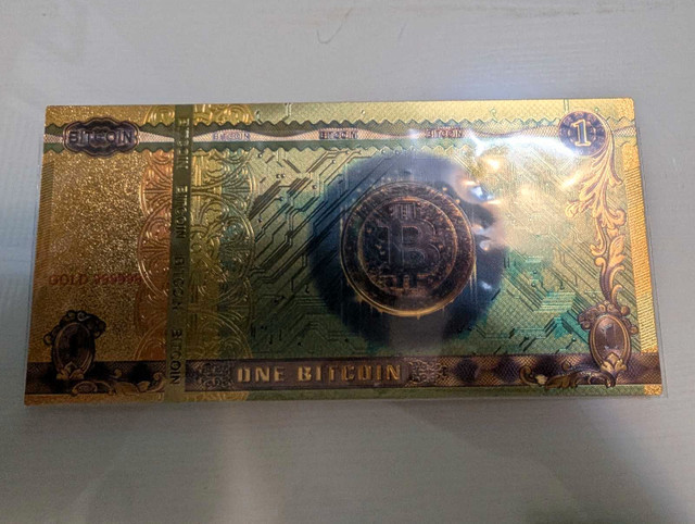 Add a unique piece to your collection with this decorative Bitcoin gold foil bill! It's in new condition, perfect for display or as a novelty item for cryptocurrency enthusiasts.