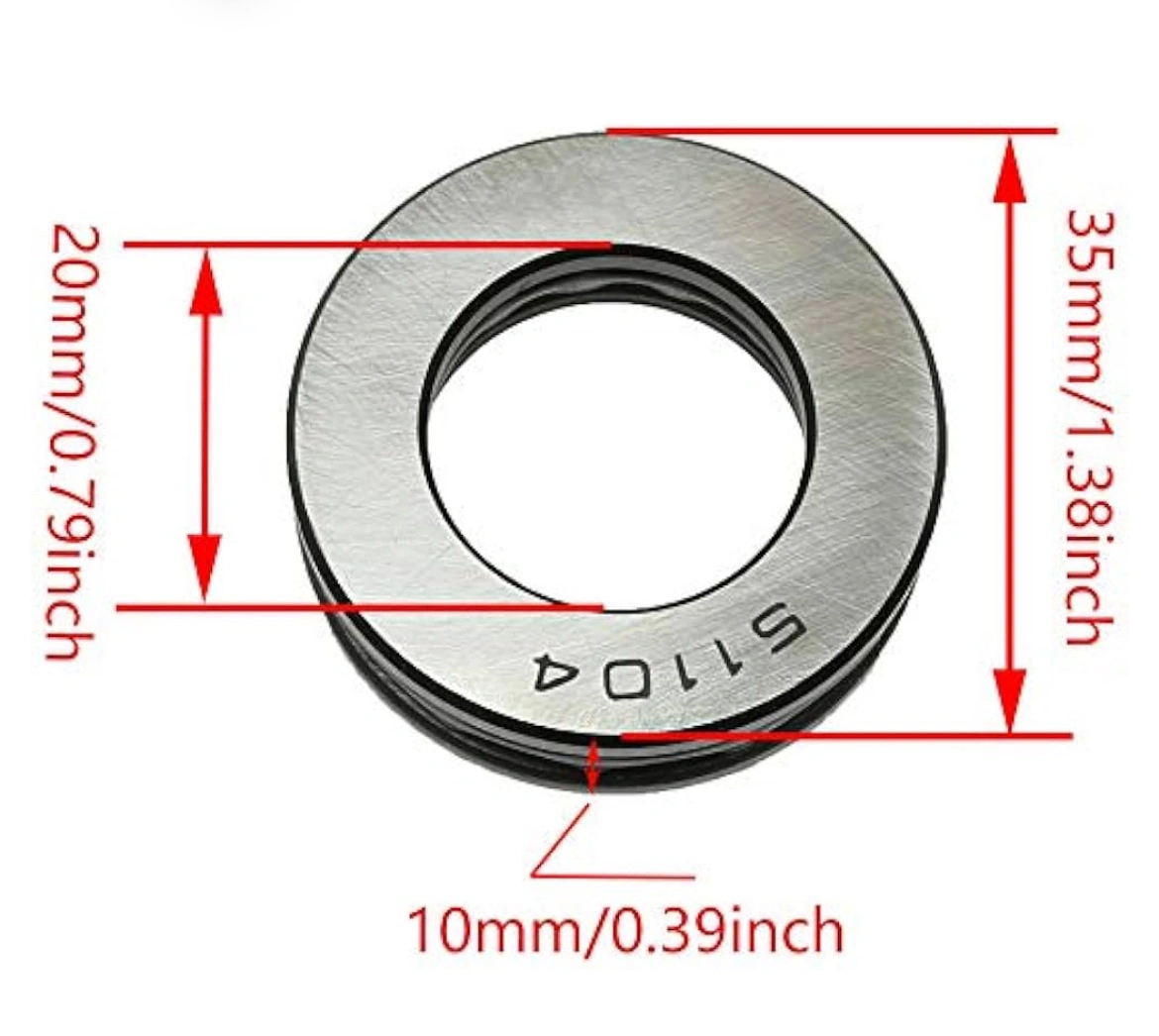 Package includes: 2PCS 51104 thrust ball bearings.Specification Product name: 51104 Thrust Ball Bearing Outer diameter: 35mm1.38inch Inner diameter: 20mm0.79inch Thickness: 10mm0.39inch Weight: 40gpiece Material: bearing steel Purpose: crane hook, vertical water pump, low speed reducer, etc.