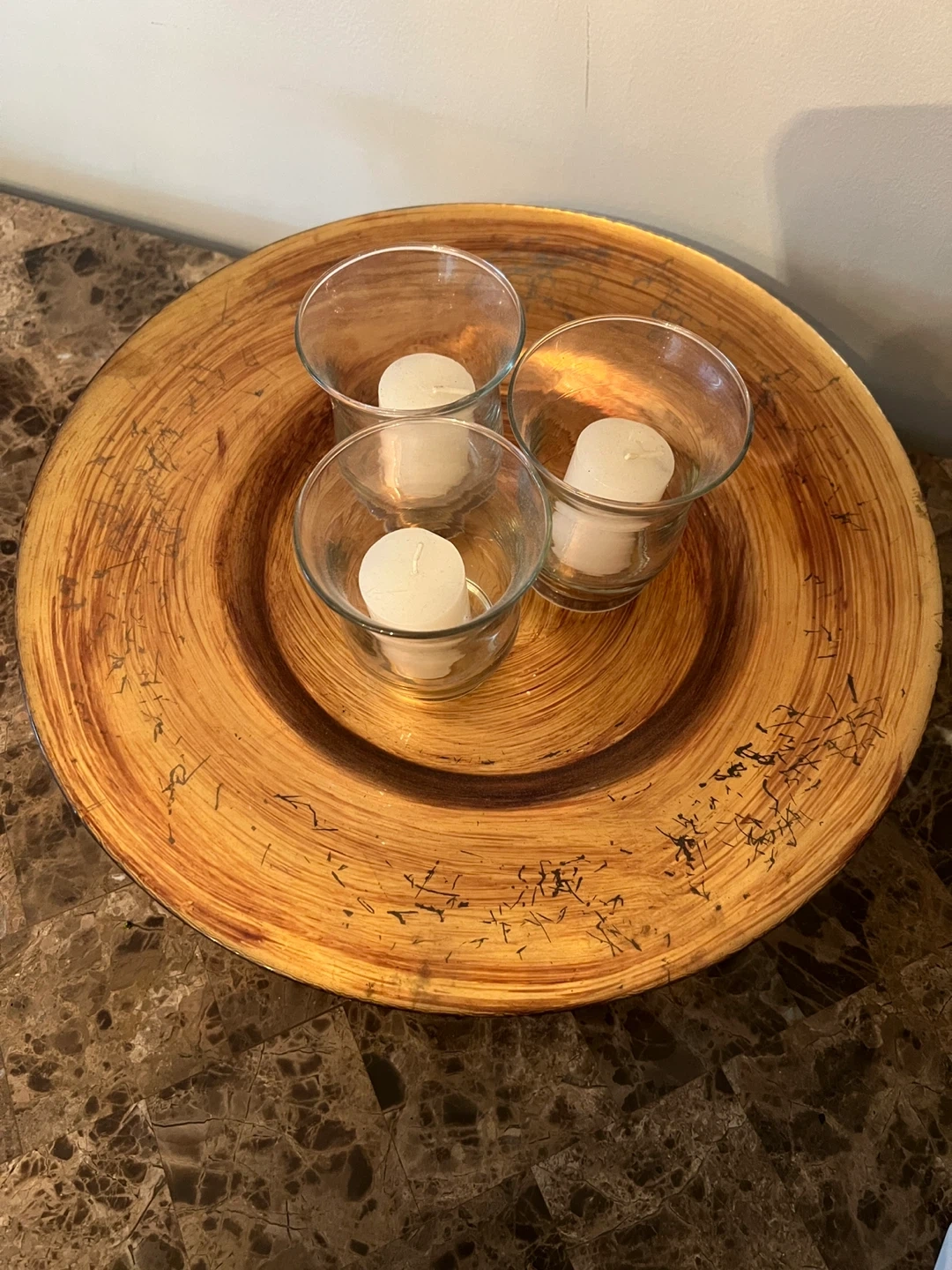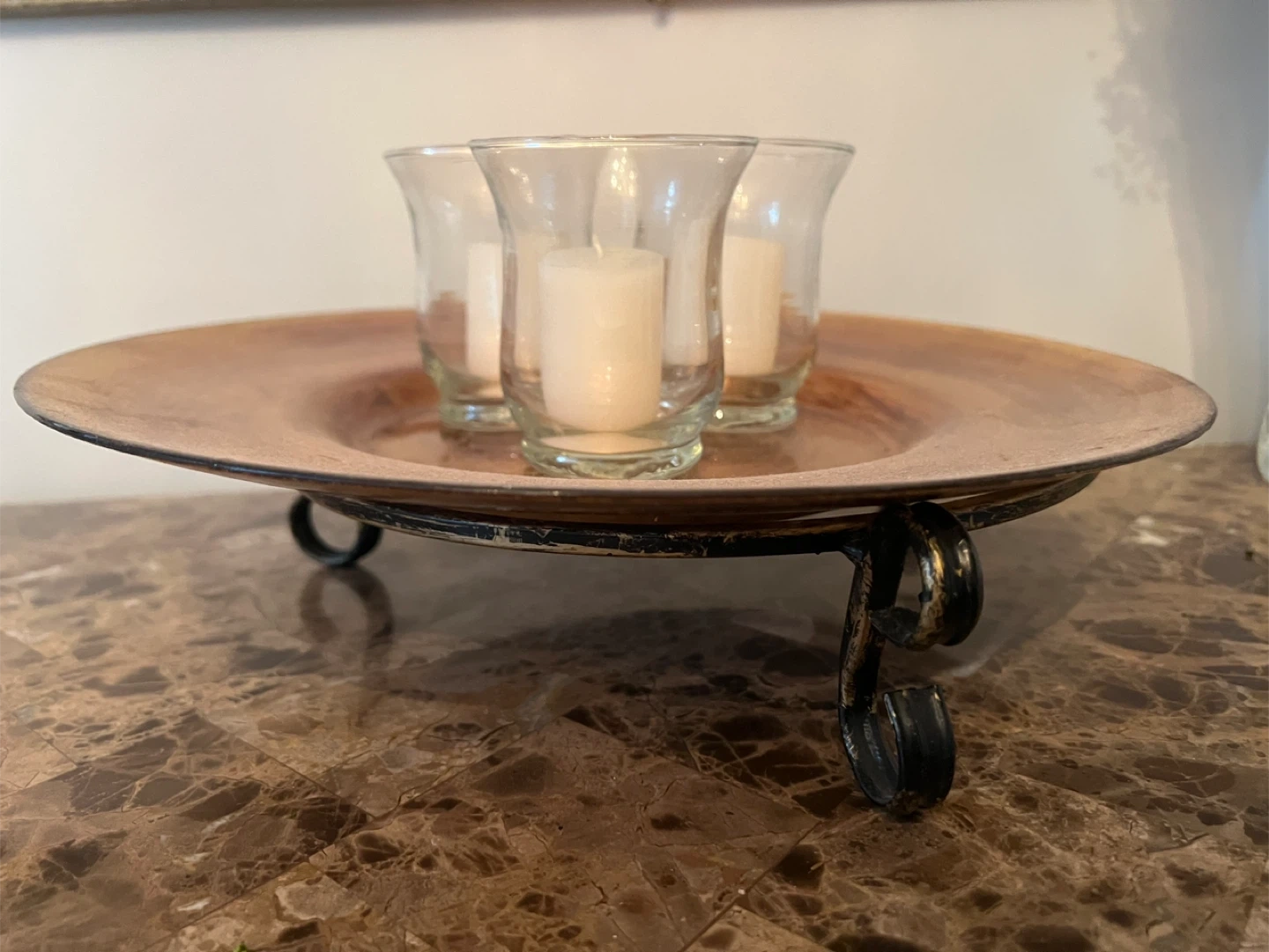 This decorative set includes a large golden-toned tray with three glass votive holders, each containing a white candle. It's a lovely accent piece for any table or mantle. The tray has a distressed wood-like finish and decorative metal legs.