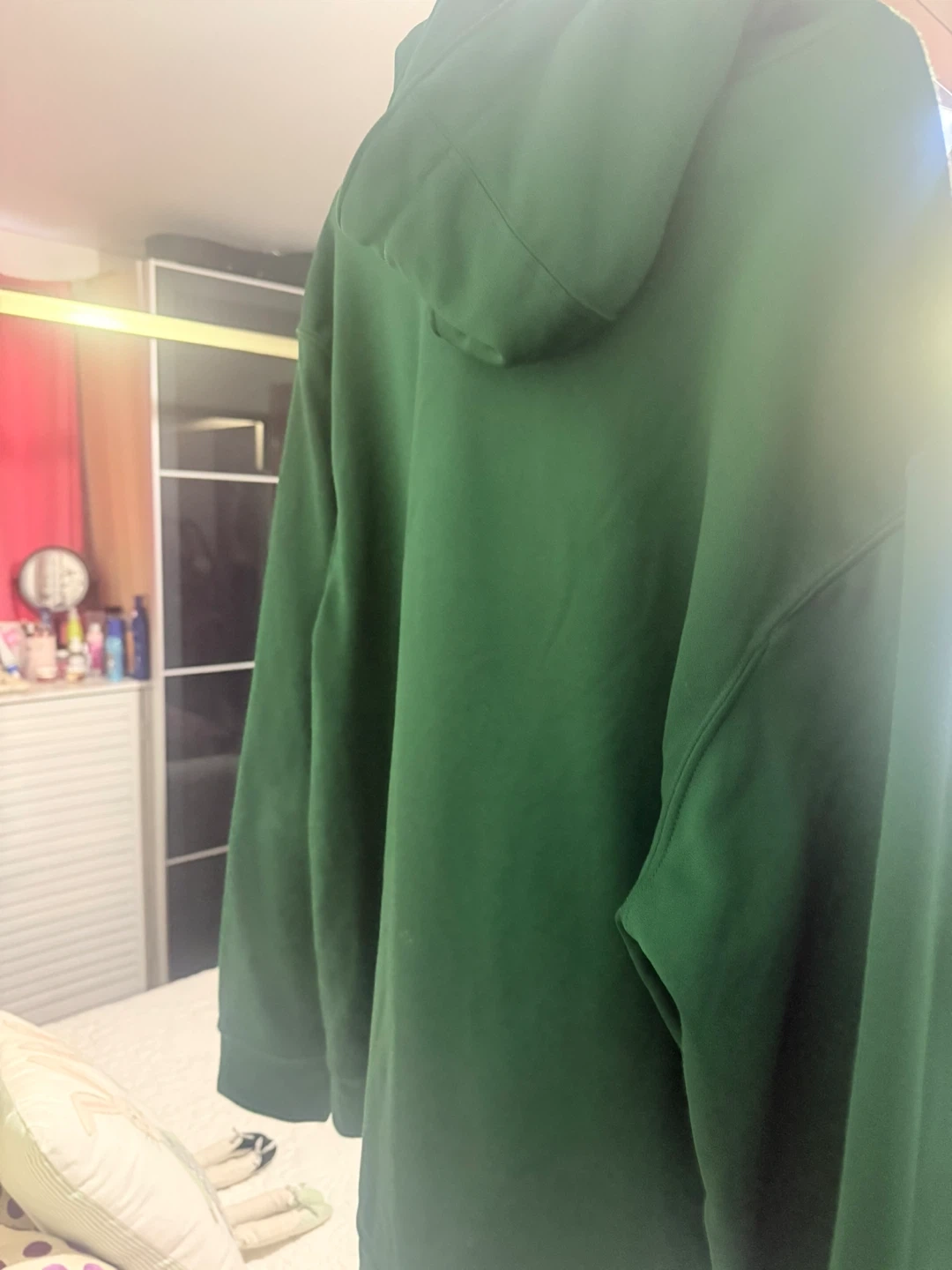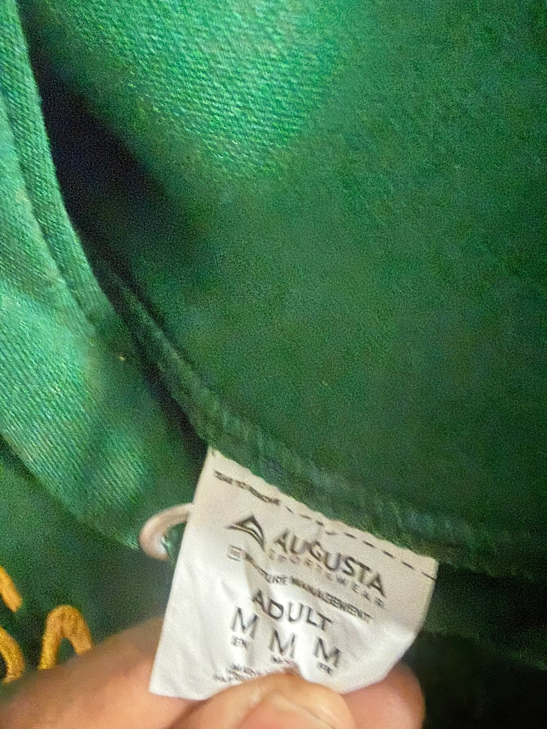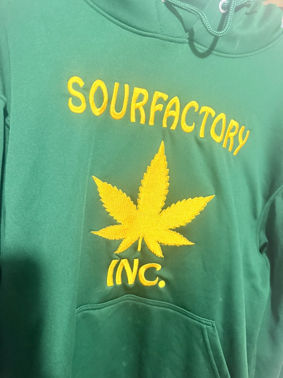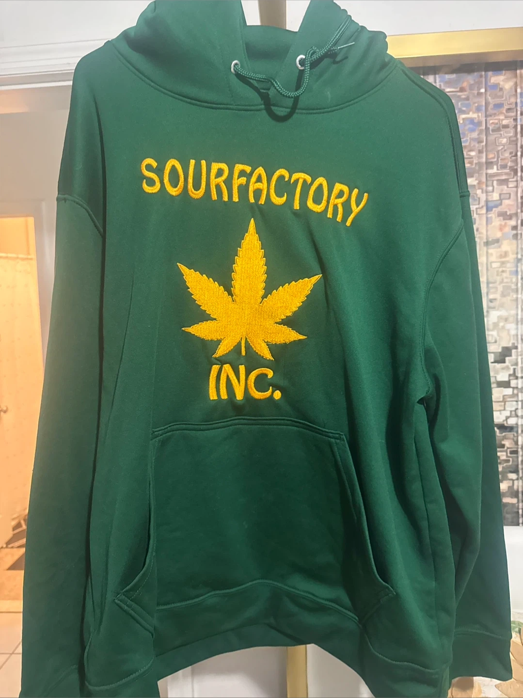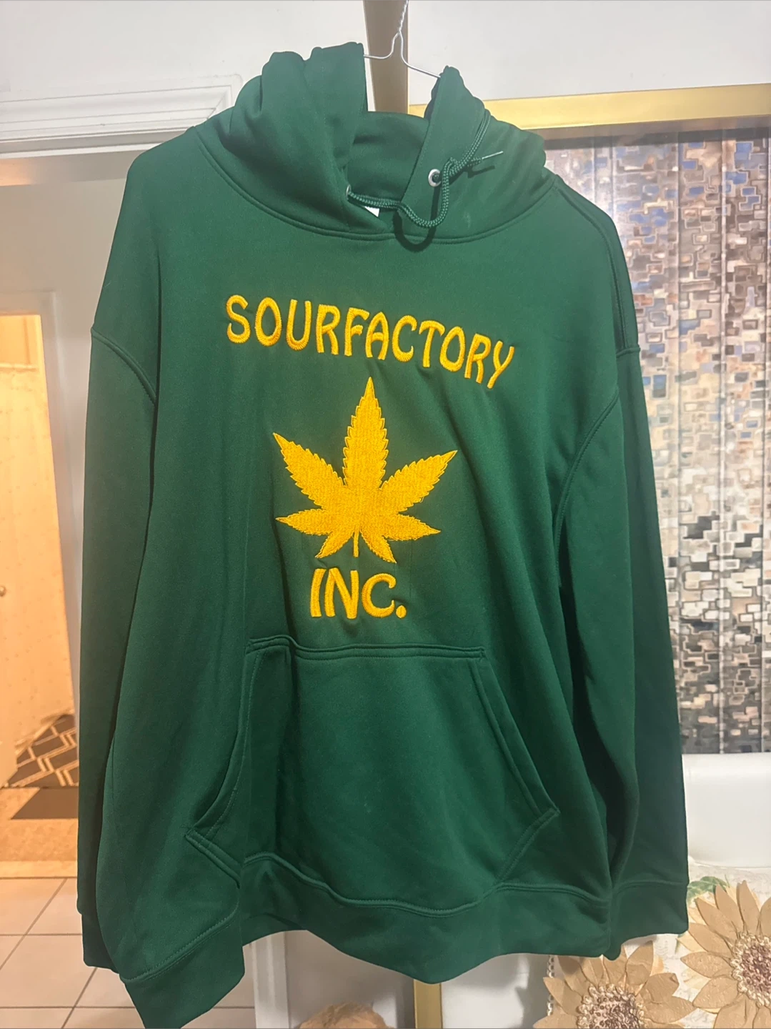 This green Augusta Sportswear hoodie features a yellow embroidered "SOURFACTORY INC." graphic with a marijuana leaf. It's a size adult medium. It has a front pouch pocket and an attached hood with drawstrings.