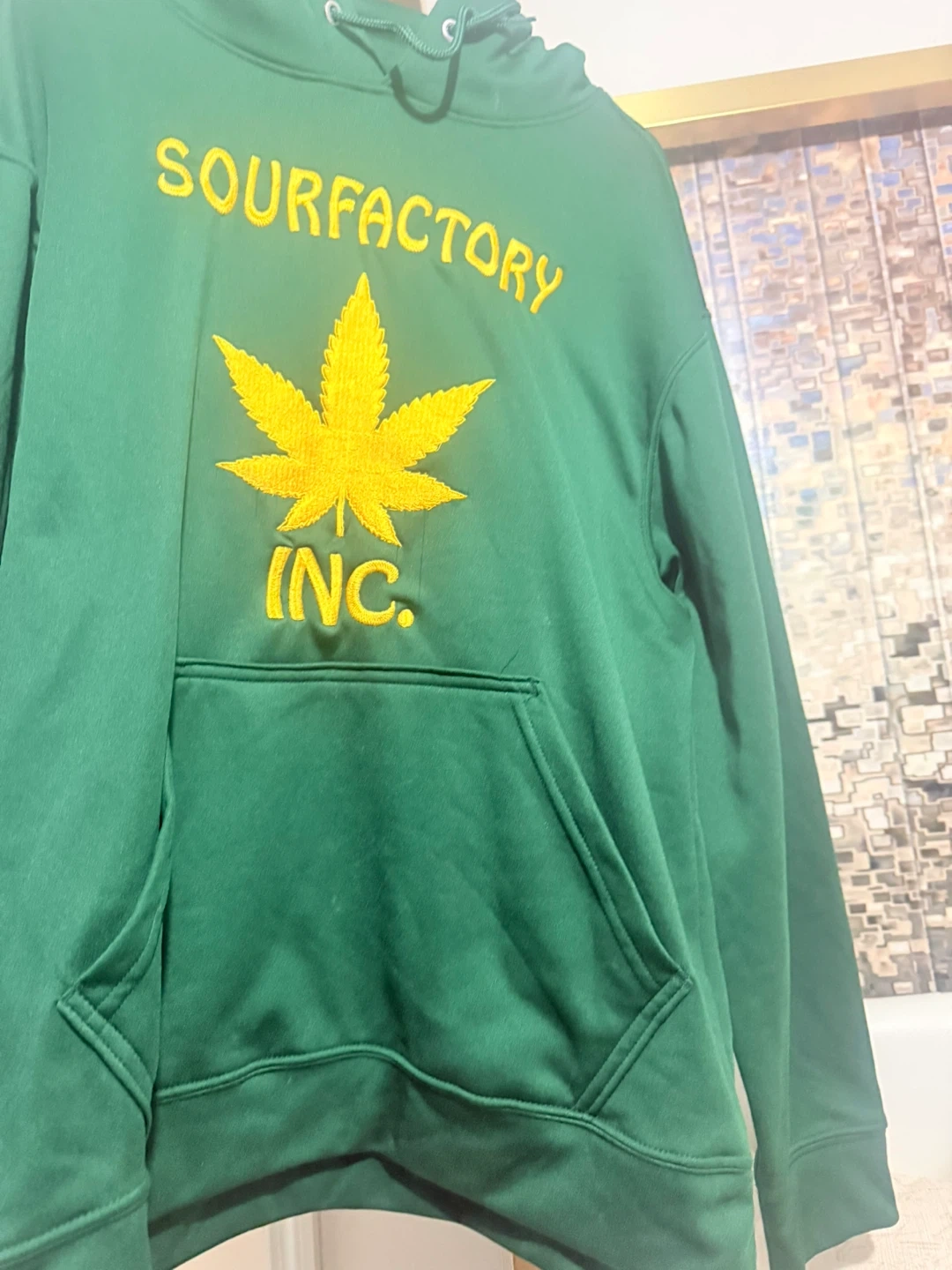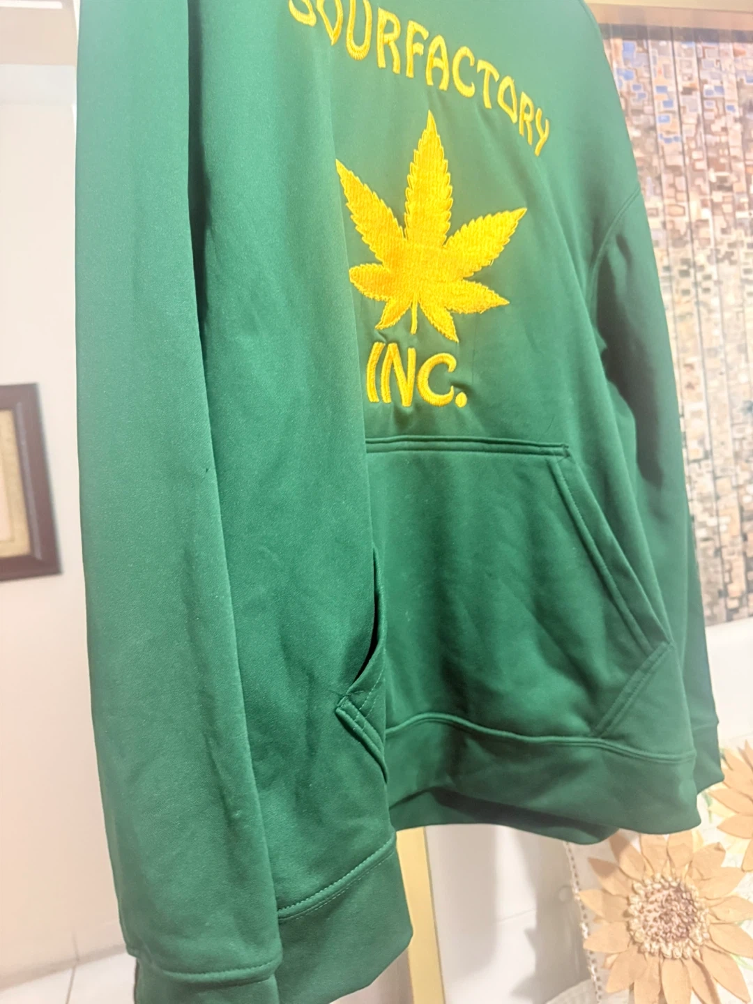 This green Augusta Sportswear hoodie features a yellow embroidered "SOURFACTORY INC." graphic with a marijuana leaf. It's a size adult medium. It has a front pouch pocket and an attached hood with drawstrings.