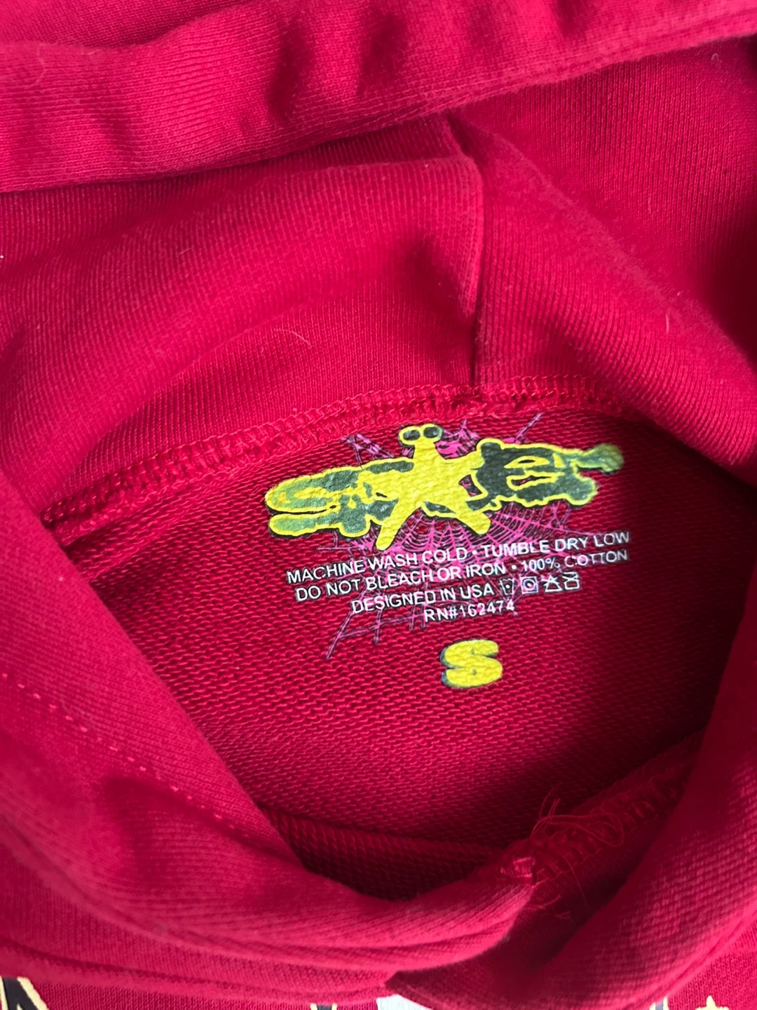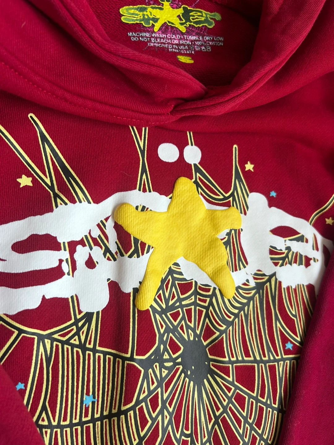 This is a red Sp5der hoodie with a yellow star and web graphic. It's made of 100% cotton. Great for casual wear!