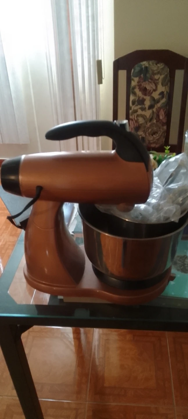 This is a like new stand mixer with a copper-coloured housing and a stainless steel bowl. It has a comfortable black handle for easy lifting and maneuvering. The mixer is designed for baking and all your other mixing needs and includes a base for stability.