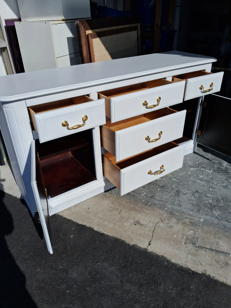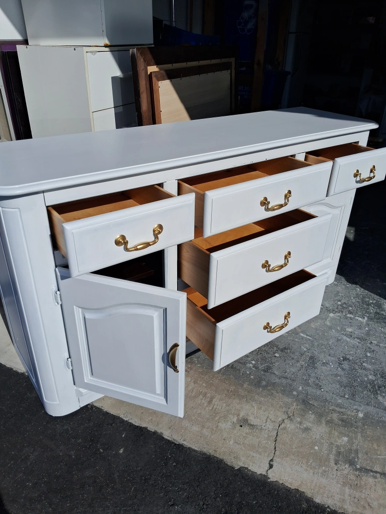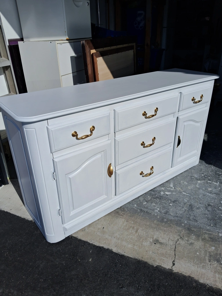 Large sideboard, painted white. Features multiple drawers and two cabinet doors. Gold coloured hardware. Excellent storage solution.