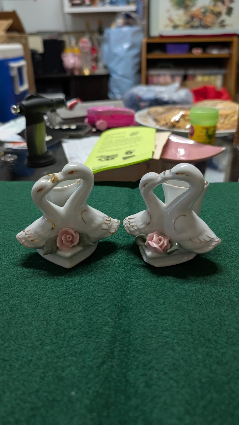 Cute pair of white porcelain candle holders. Each holder features two swans kissing with gold trim and a pink rose design. They're perfect for small floral arrangements or as decorative accents.