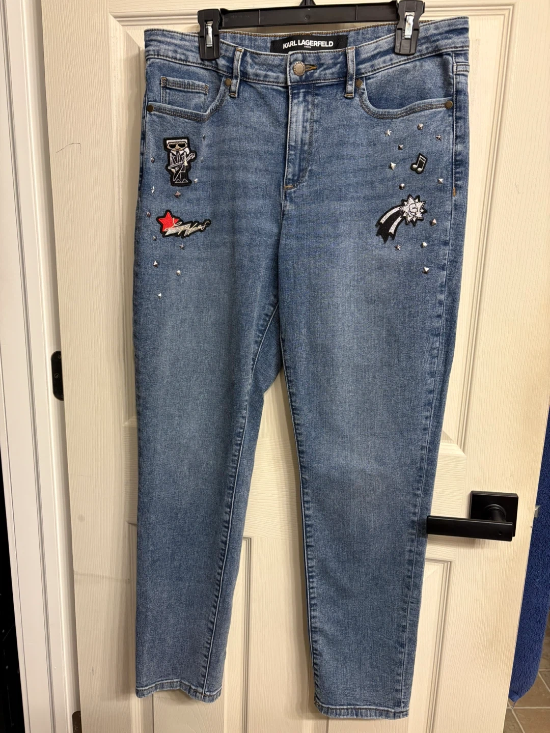 These Karl Lagerfeld jeans are a size 12. They feature a light wash denim with embroidered patches and stud details. Great condition, just like new! Pick up in Chestermere.